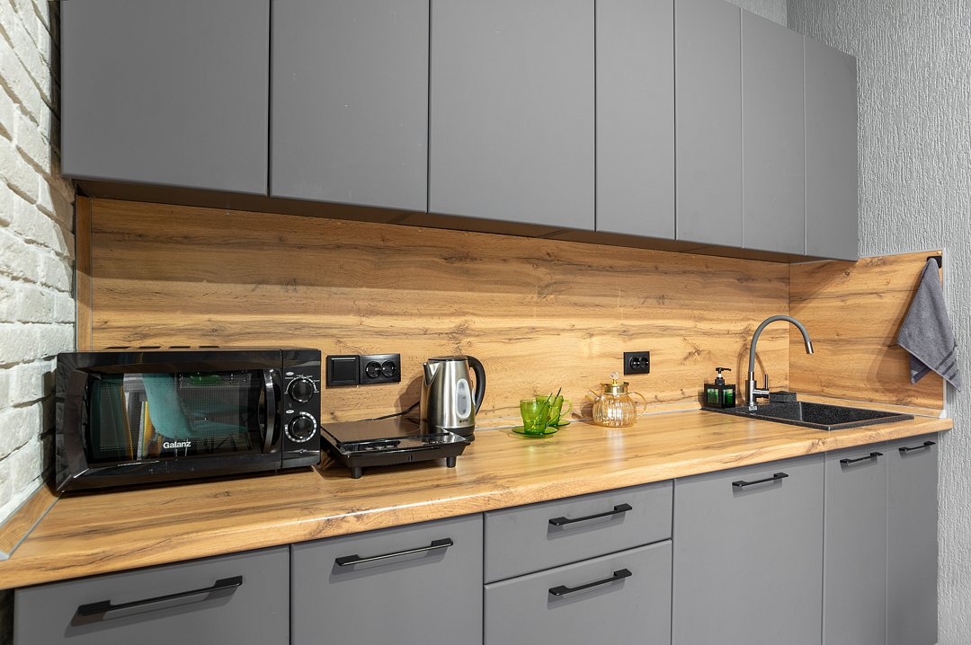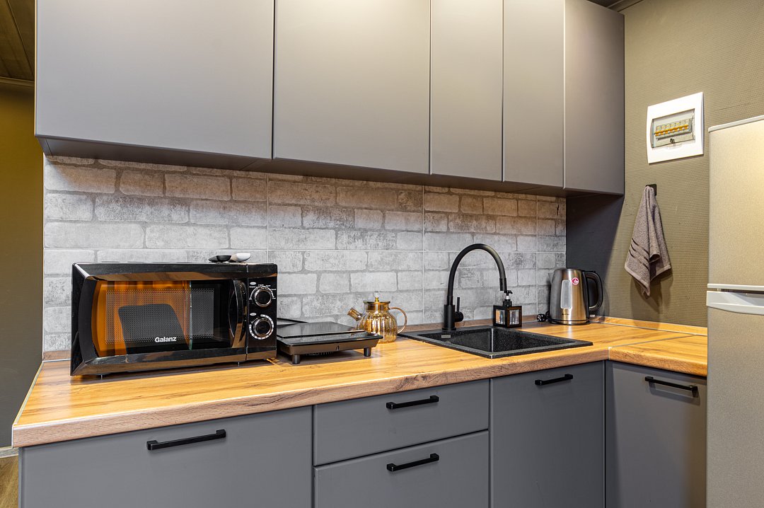 - укомплектованную посудой, приборами и принадлежностями даже для длительного проживания кухню;