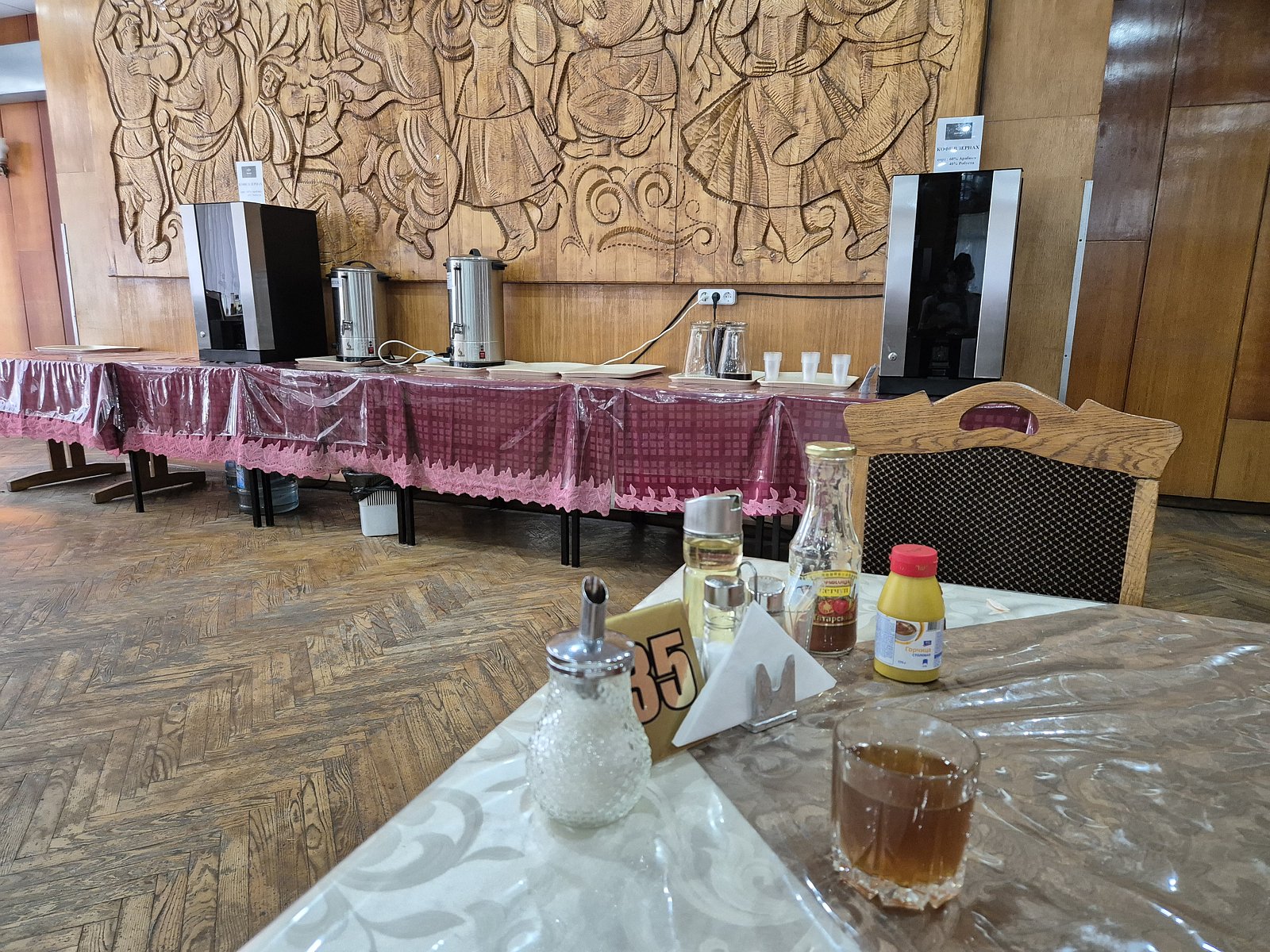 июль 2021 г.Назад в СССРОтдыхала в июле, главная цель была - лечение: воды, массажи, бассейн. Увидев стоимость, которая была в 2 раза ниже, чем в остальных санаториях, я сразу поняла, что на комфорт особый возлагать надежд не стоит. Ждал меня вполне комфортный номер, да, ремонта там не было давно, на полу паркет, по которому ступали много лет, но сантехника и плитка в ванной были чистые и целые, кровать комфортная, холодильник работал, с балкона открывался чудесный вил на Эльбрус и зеленую территорию, пели птицы. Еда в столовой была очень вкусная и разнообразная, а главное - приготовлена правильно, не было никаких проблем с ЖКТ. Было назначено много процедур - массаж, подводный массаж, души, грязи, ингаляции, орошения и тд. Огромный бассейн, доступный в любое время. Большая зеленая территория, на которой я встречала белочек, ежиков и очень много разных птиц. Особое слово персоналу - все приветливые, приятно было ходить на процедуры.