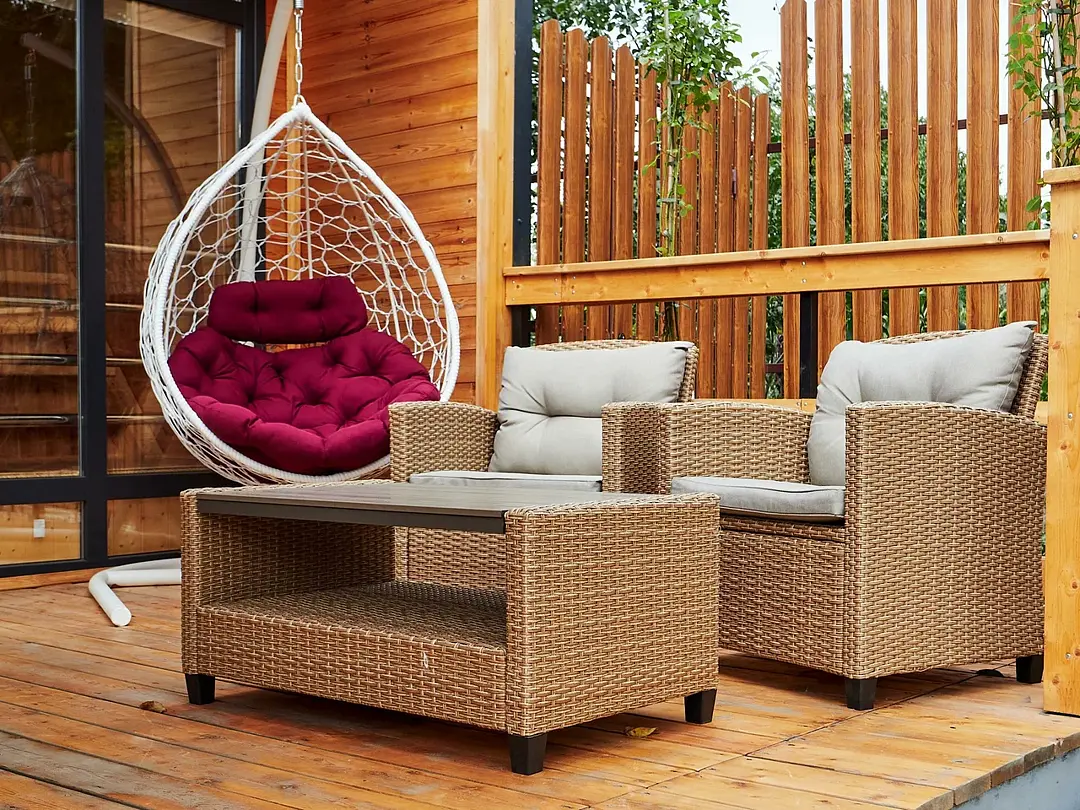 Домик — с открытым балконом, на 2 этаже две спальни и зона отдыха с двумя креслами и телевизором, столик .