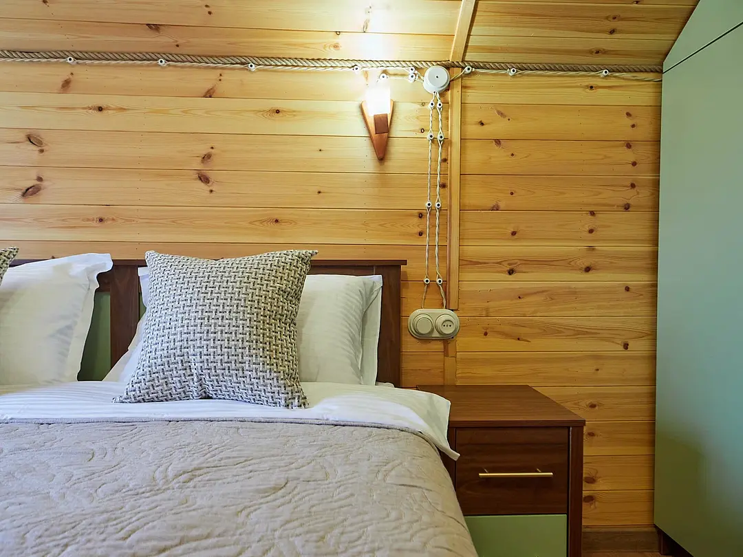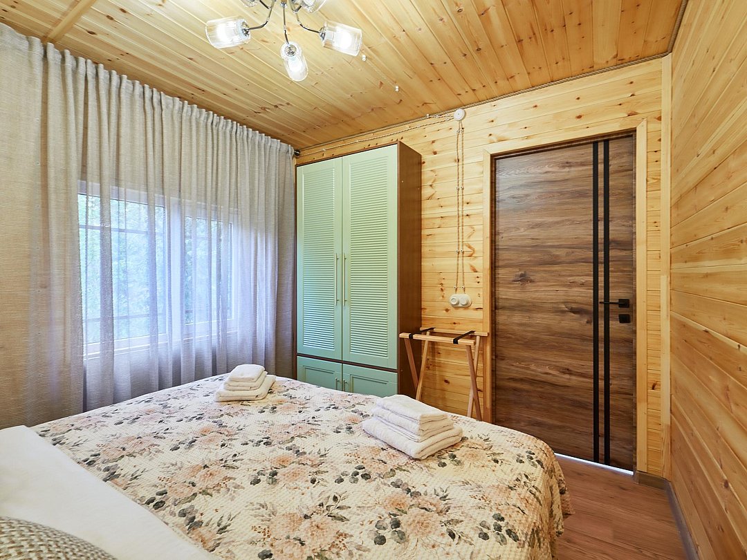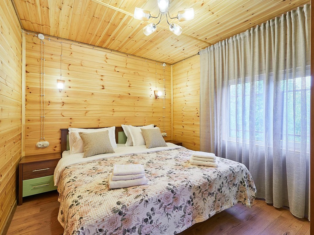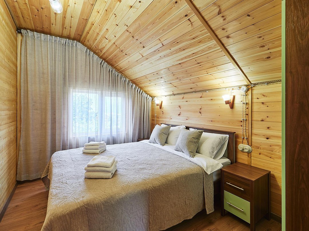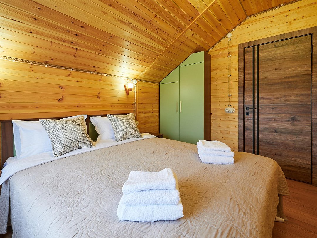 Каждый из домиков встретит Вас домашней атмосферой и предоставит всё необходимое для комфортного проживания: удобную мебель, оборудованный кухонный уголок, телевизор и зону отдыха на террасе. Стены украшены рукотворными картинами.
