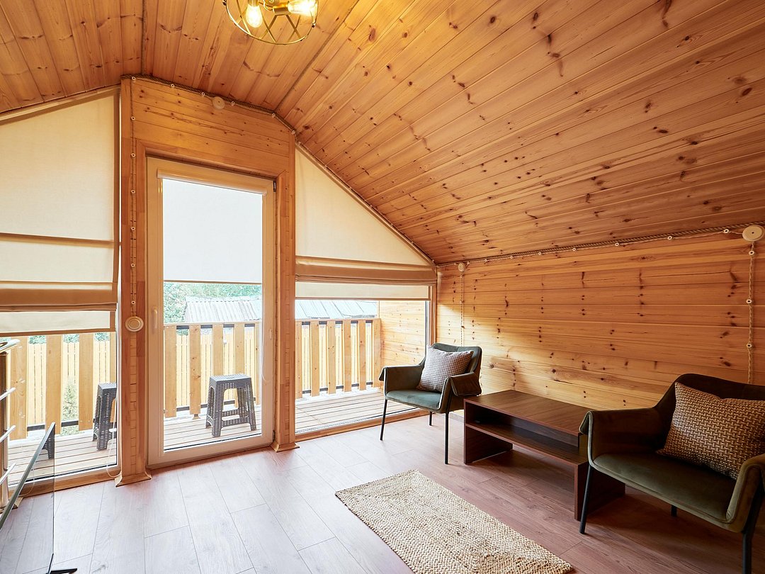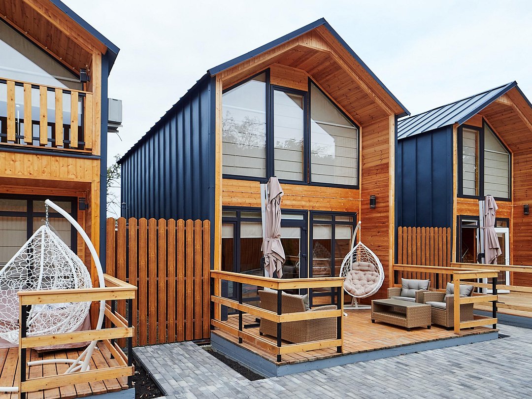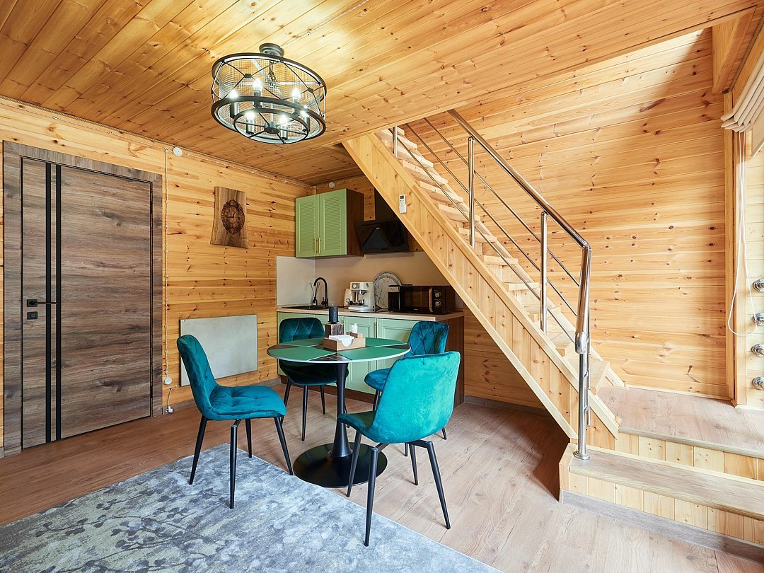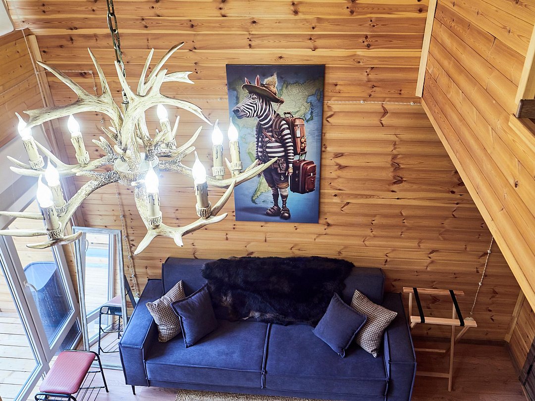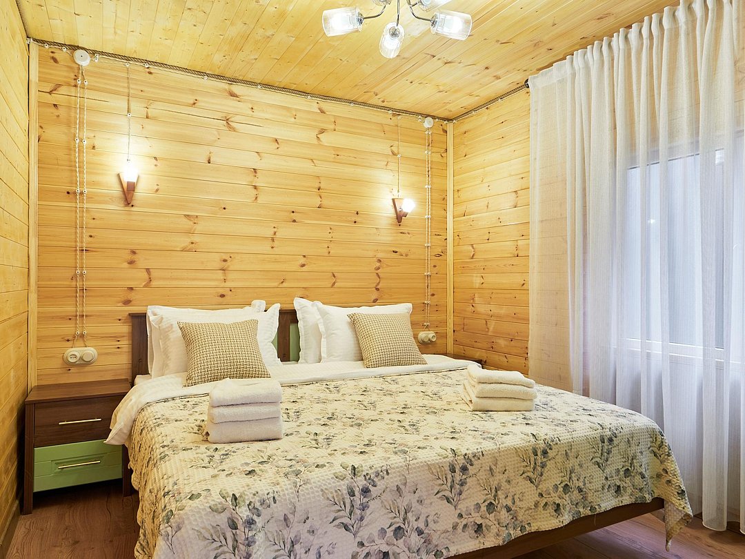 Каждый из домиков встретит Вас домашней атмосферой и предоставит всё необходимое для комфортного проживания: удобную мебель, оборудованный кухонный уголок, телевизор и зону отдыха на террасе. Стены украшены рукотворными картинами.
