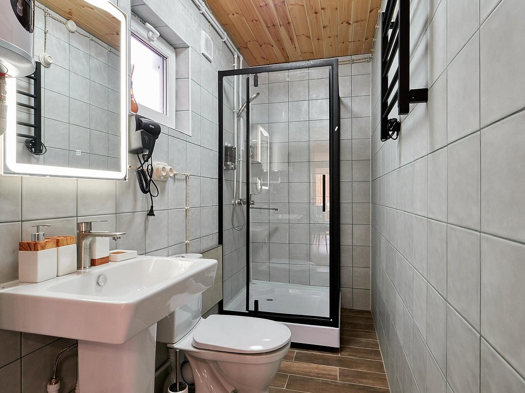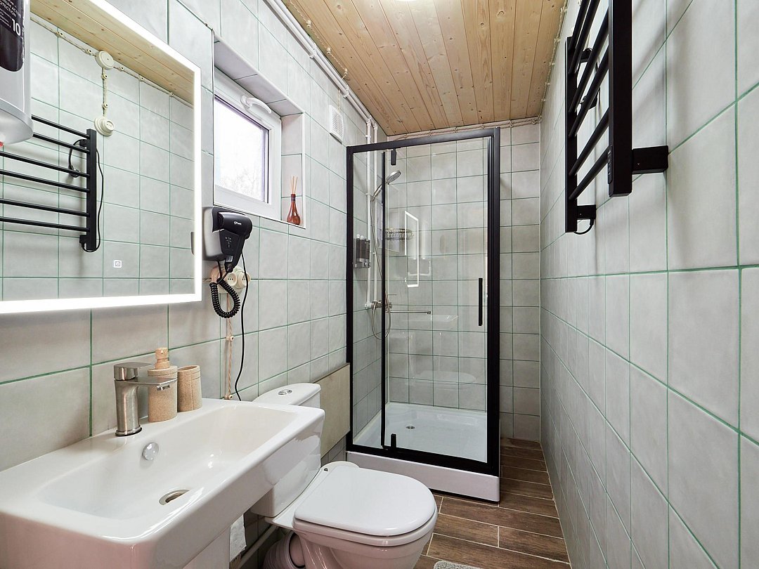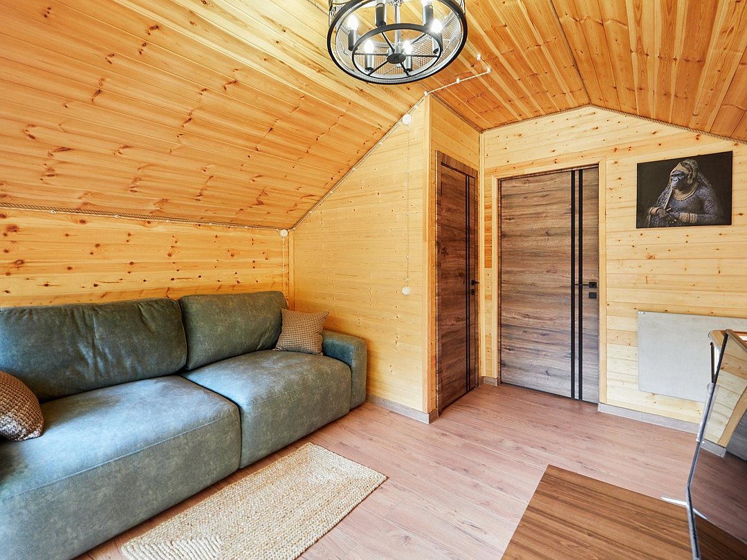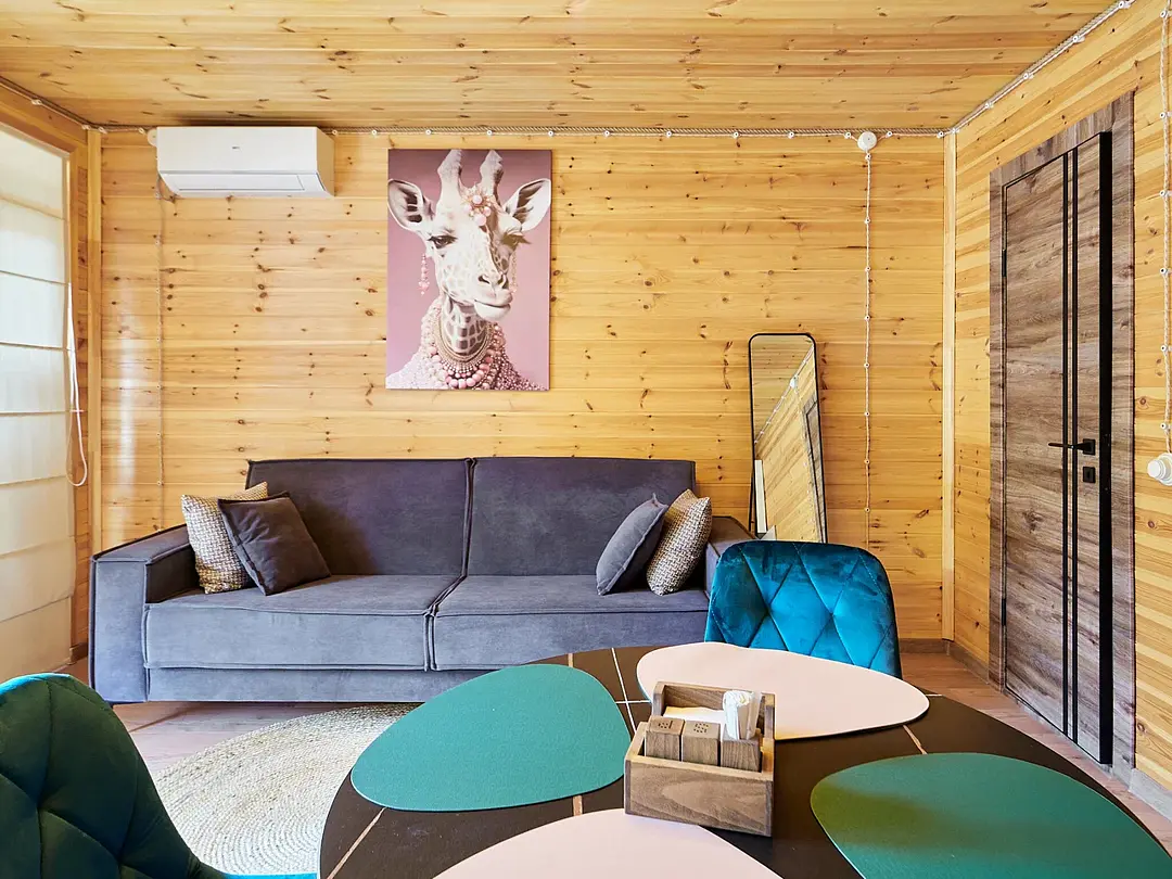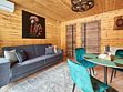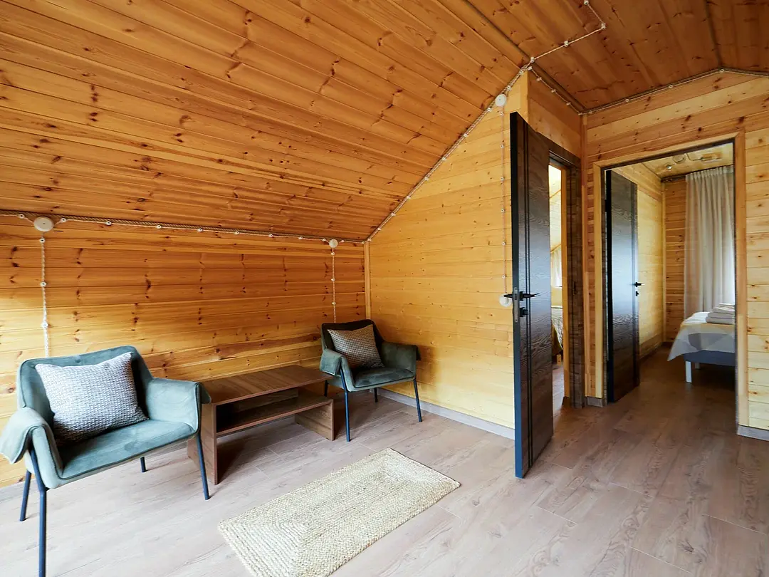 Каждый из домиков встретит Вас домашней атмосферой и предоставит всё необходимое для комфортного проживания: удобную мебель, оборудованный кухонный уголок, телевизор и зону отдыха на террасе. Стены украшены рукотворными картинами.