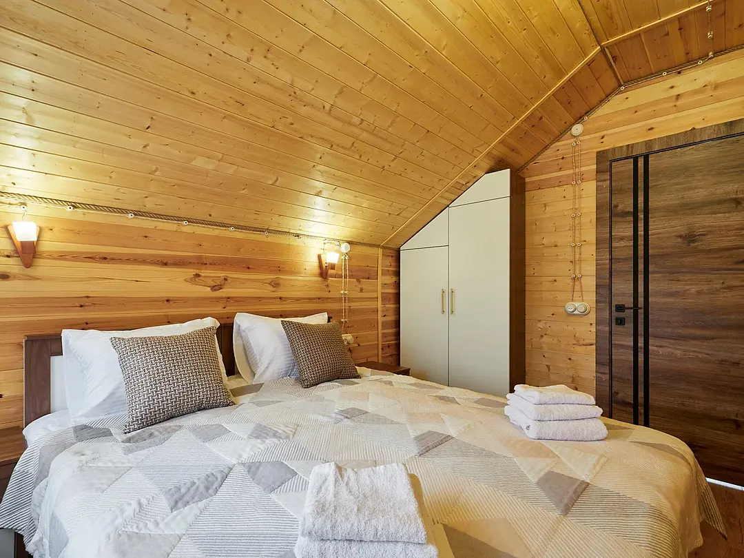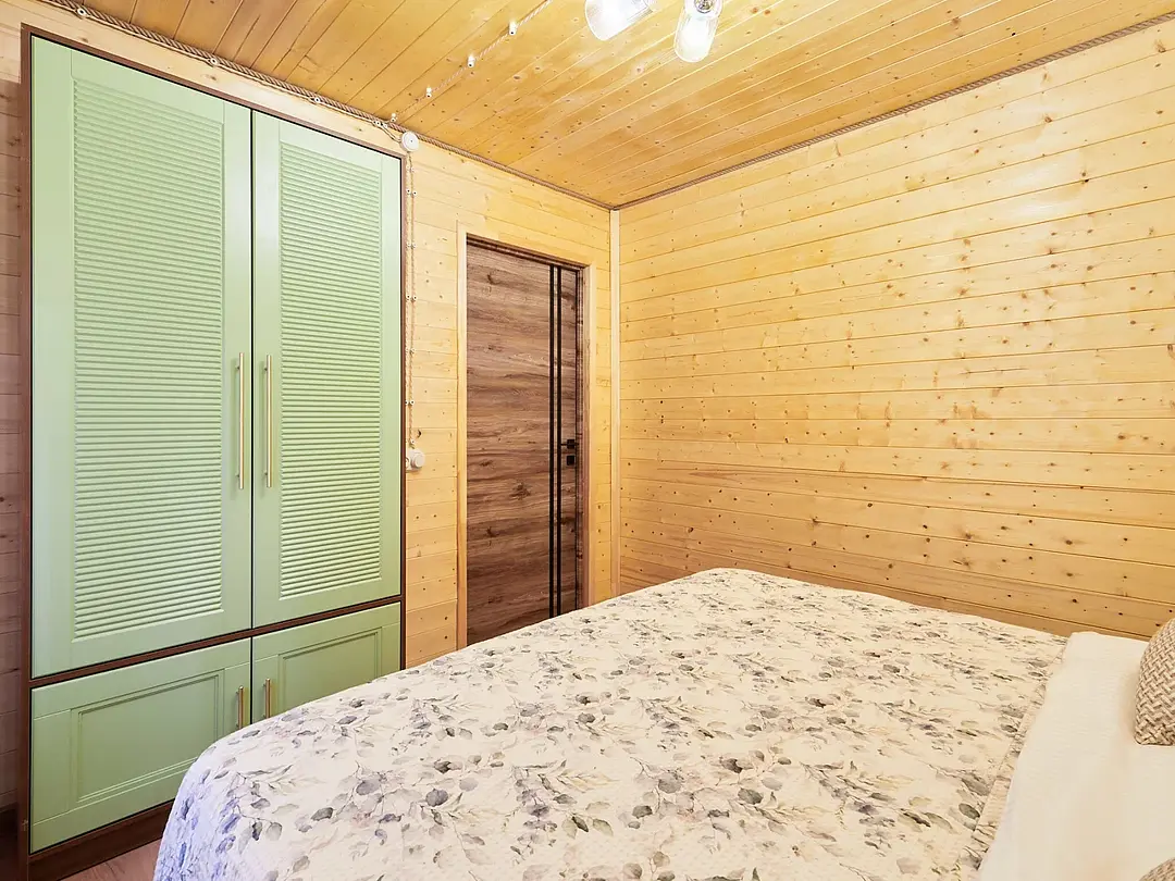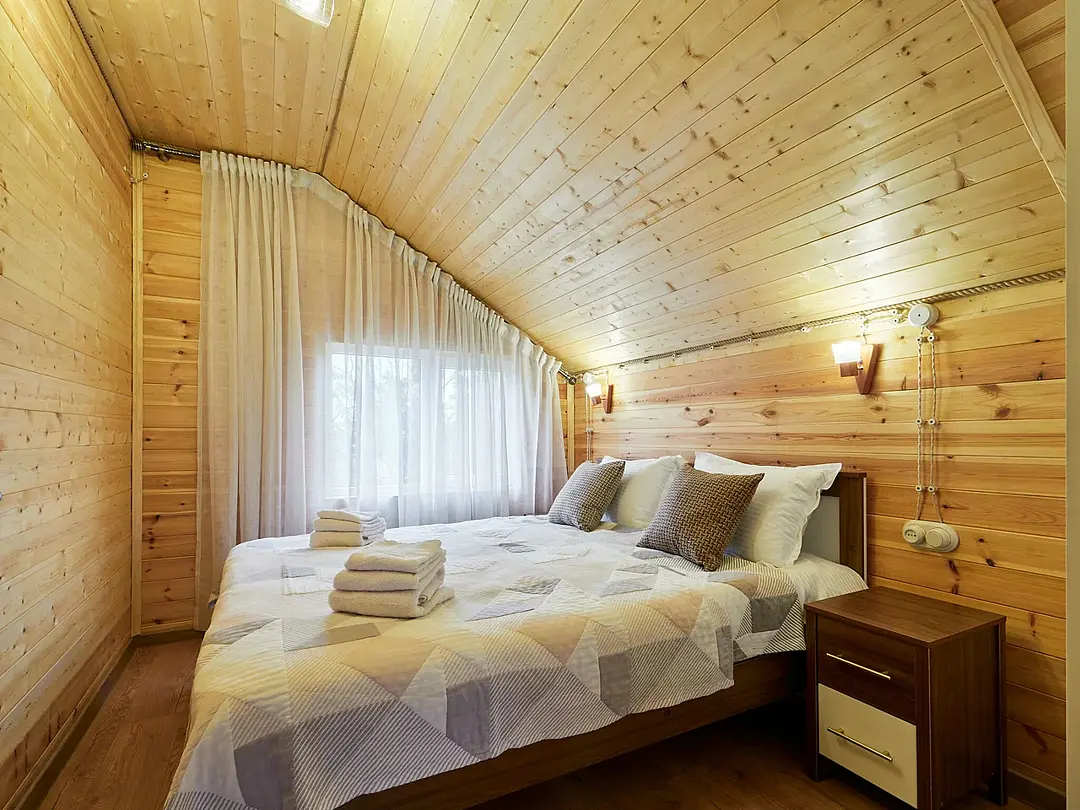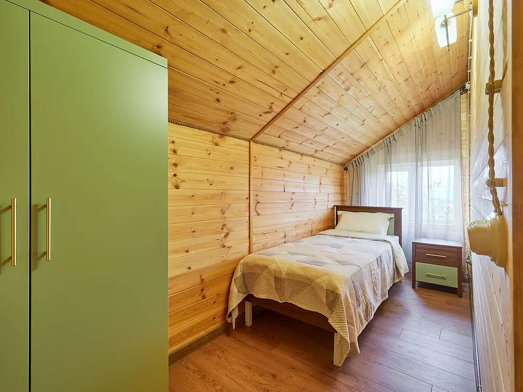На 2 этаже имеется 2 спальни — одна спальня с кроватью односпальной, шкафом и прикроватной тумбочкой. Во второй спальне отличия — в 1 и 2 домиках стоят по две односпальные кровати, шкаф и 2 прикроватные тумбочки.