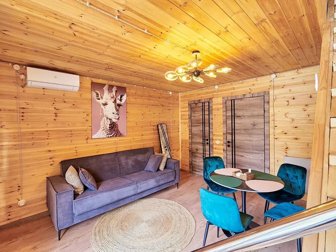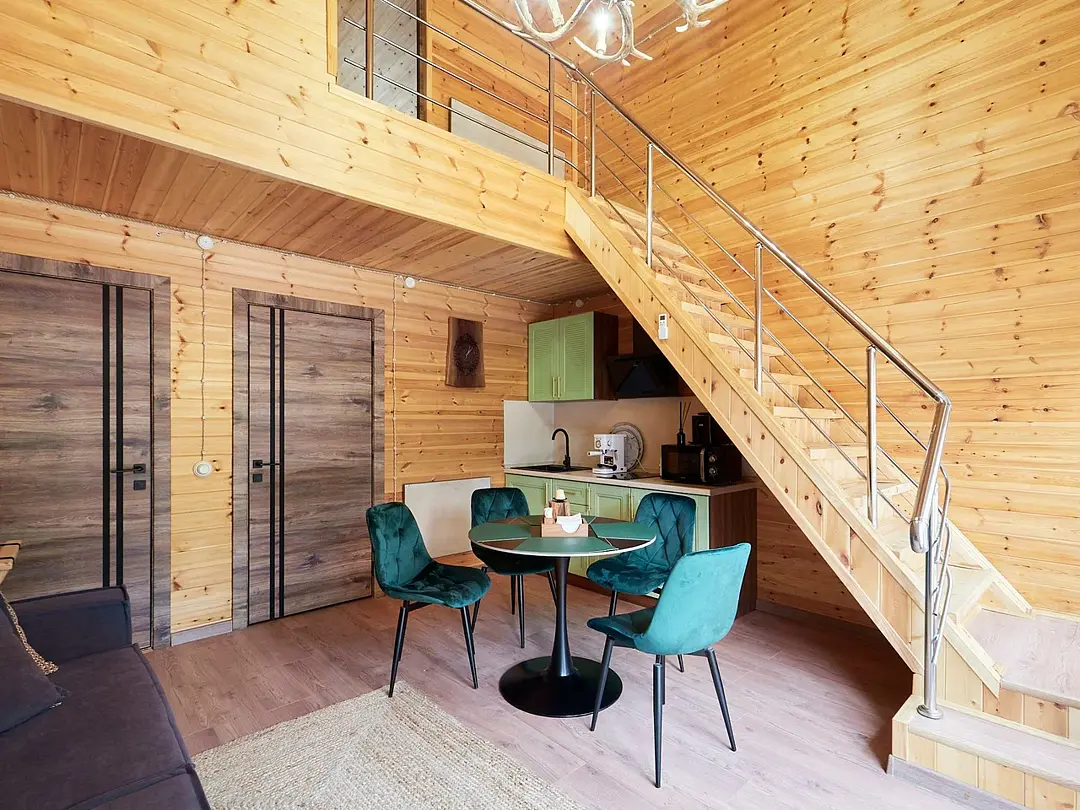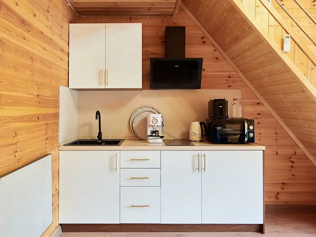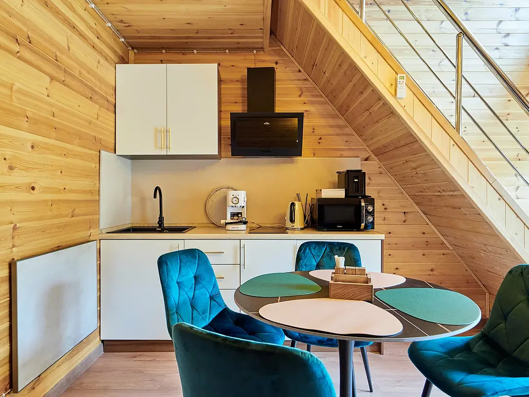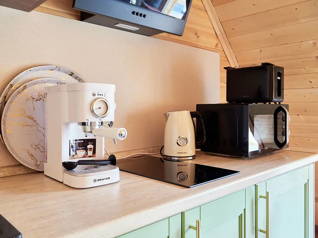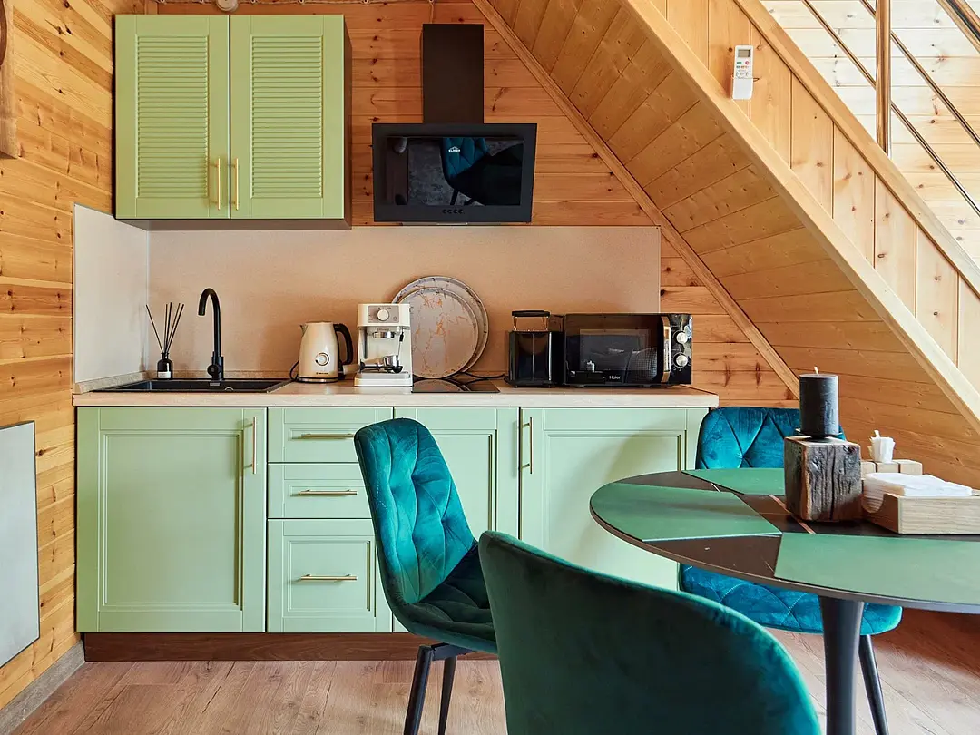 Домик — балкончик и на 2 этаже зона отдыха с диваном, телевизором и столиком. на 1 этаже есть кухонный гарнитур с вытяжкой, холодильник, индукционная печь, тостер, микроволновая печь, кофемашина, электрический чайник. Столовая посуда, приборы столовые, ложки, заварочный чайник, кастрюля и сковорода. На стене оригинальные картины.