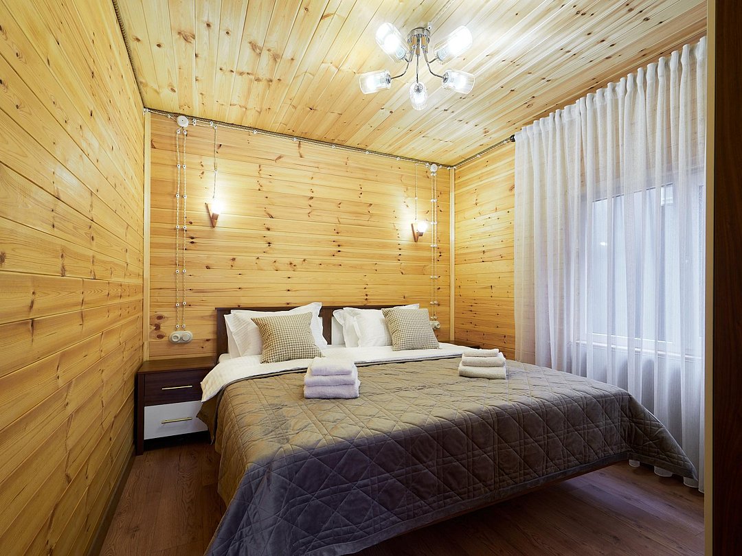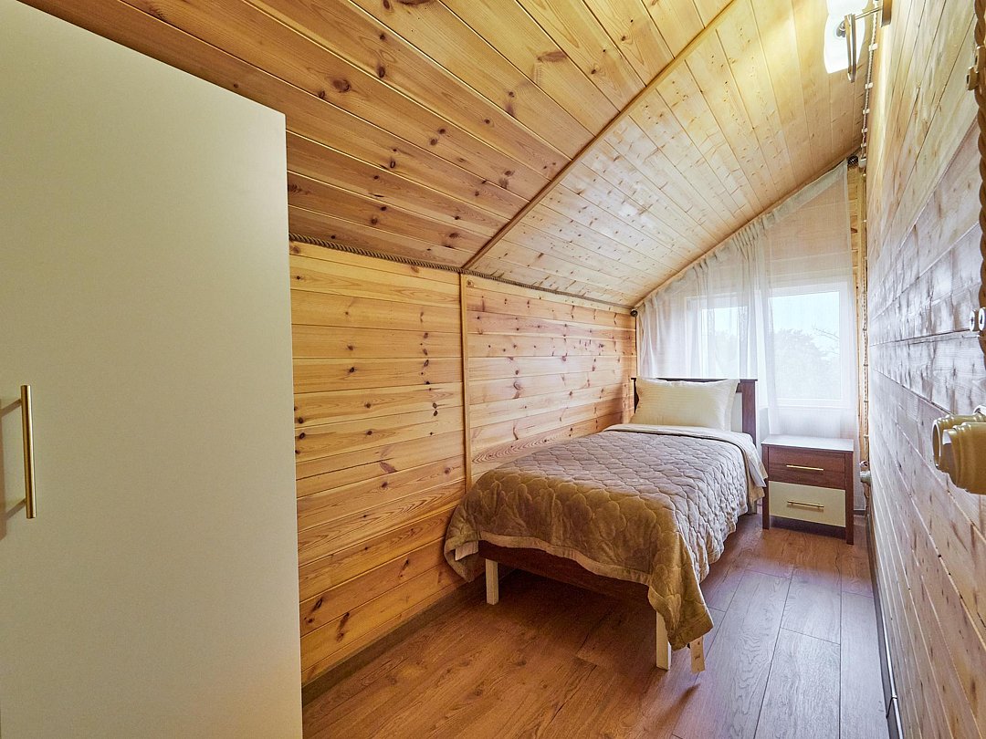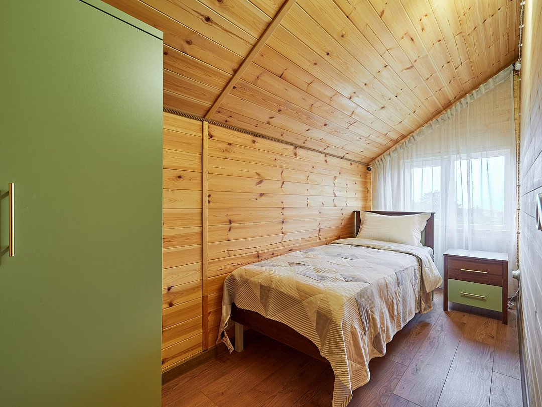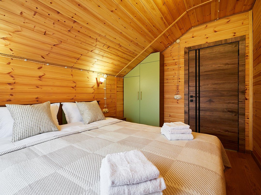 - Две спальни: одна с односпальной кроватью, шкафом и прикроватной тумбочкой, вторая — с двумя односпальными кроватями, вместительным шкафом и двумя тумбочками.