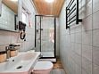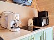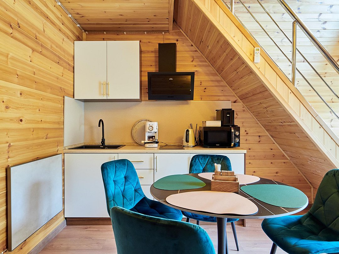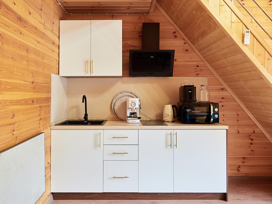 - Полностью оборудованная кухня: стильный гарнитур с вытяжкой, холодильник, электрическая плита, микроволновая печь, кофемашина и электрический чайник.