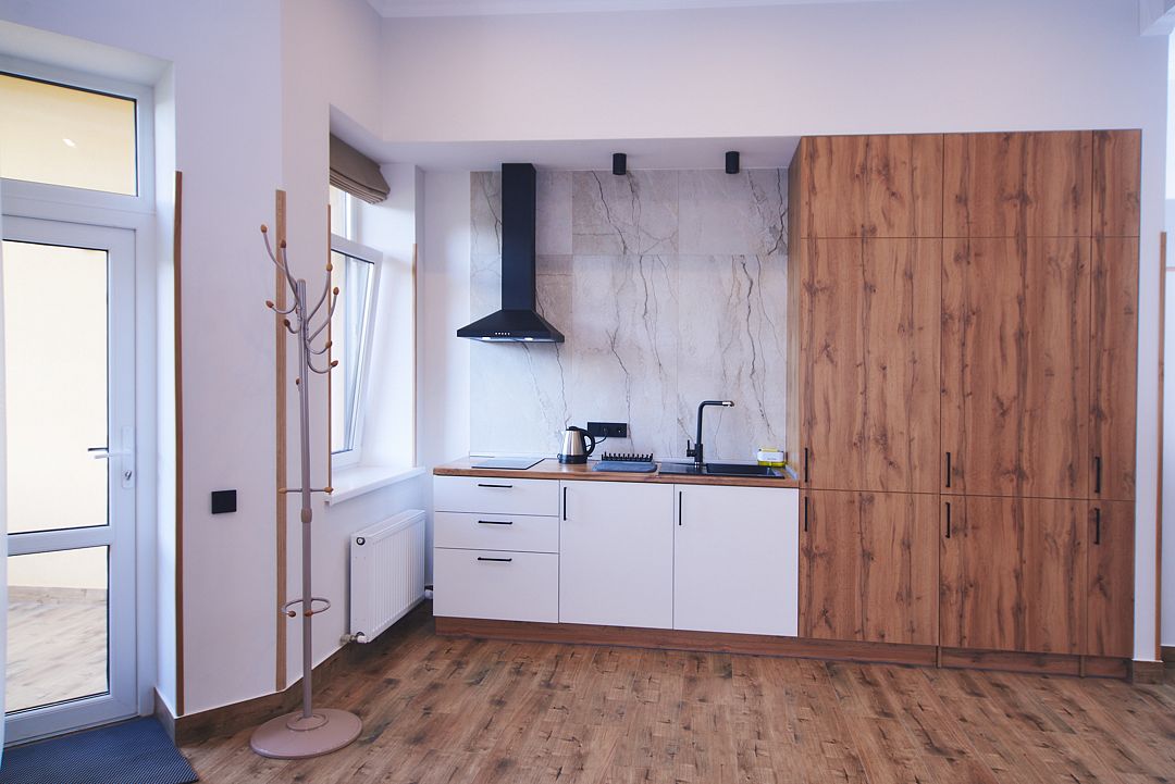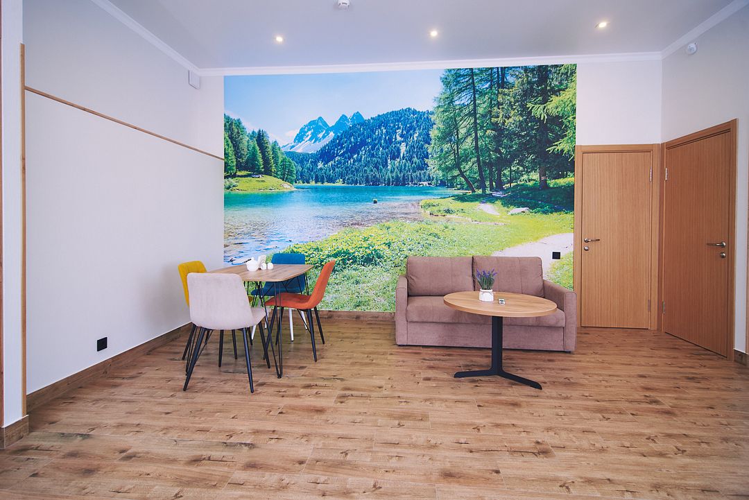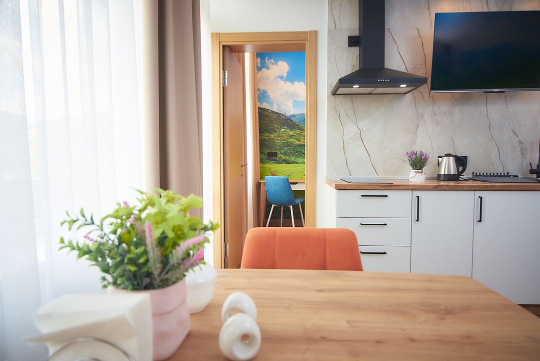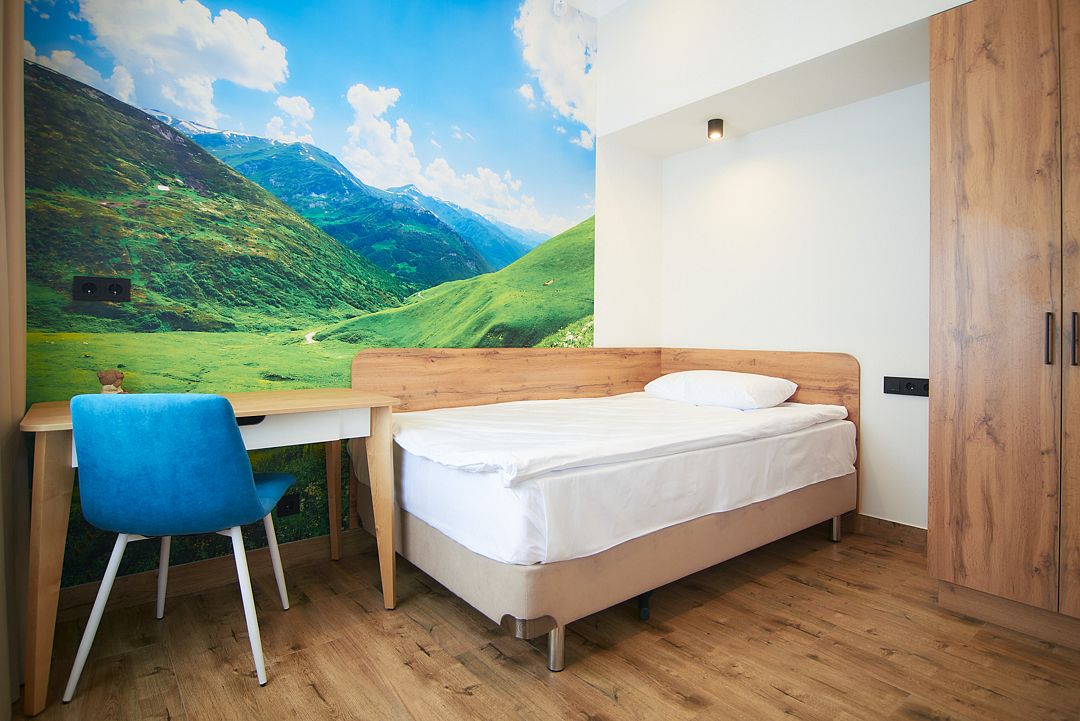 Трехэтажное здание гостевого дома разместилось в окружении рельефного ландшафта – ценителям природы придется это место по душе. Жилой фонд включает в себя комфортабельные апартаменты с кухней. Номера оснащены всем необходимым, начиная от электроплиты на кухне, и заканчивая феном в санузле. Современные интерьеры комнат оформлены в светлых тонах с добавлением ярких деталей.