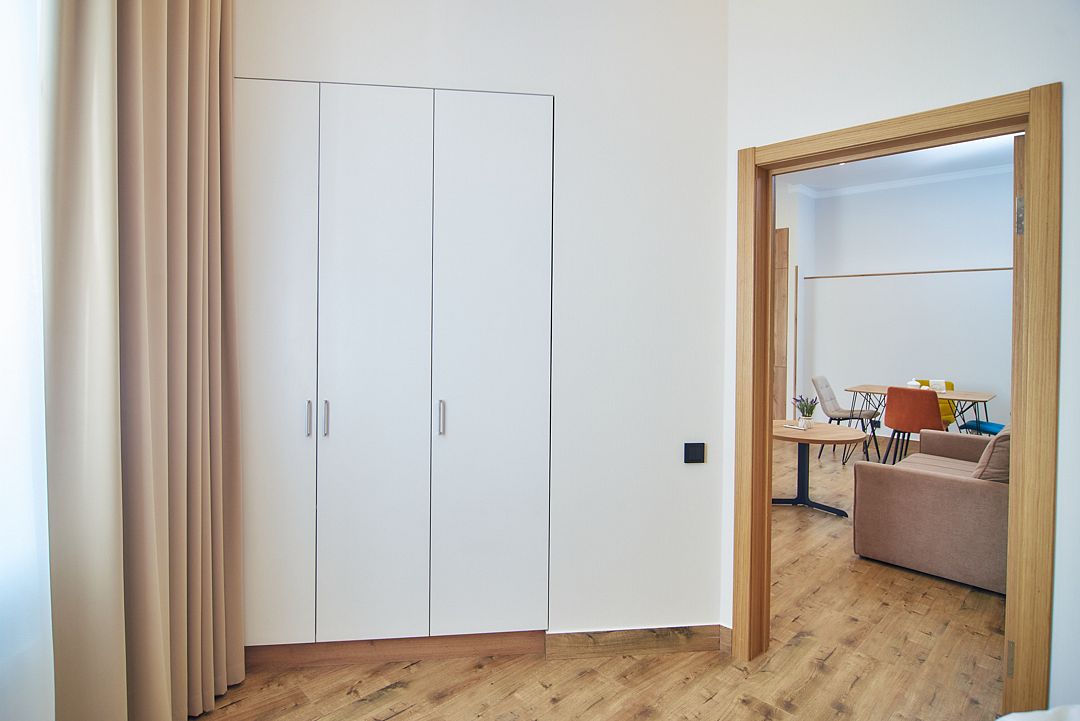 2-спальная кровать, прикроватные тумбочки, шкаф, вешалка, диван, встроенная кухня, стол, стулья