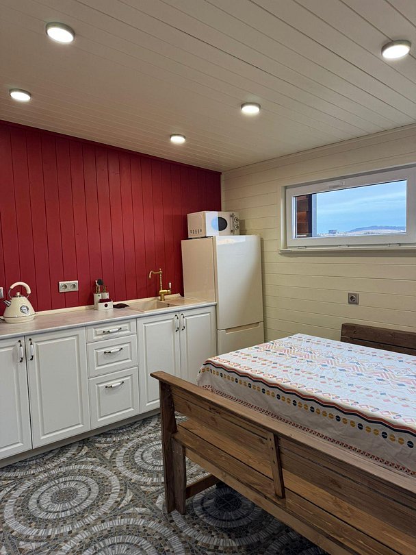 Стильная мебель и техника: 2 холодильника в доме, 1 в бане, 2 кондиционера, чугунная печь-камин, варочная плита, микроволновая печь, чайник, телевизор, проигрыватель с пластинками, колонка с двумя микрофонами, фен, отпариватель, постельное белье, пледы.