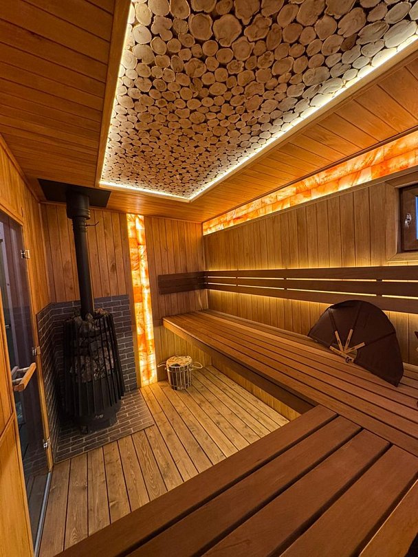 Купель с подогревом до 45°C, гидромассажем и подсветкой.