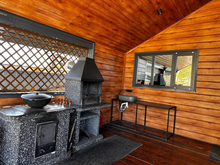 В доме есть просторная баня на дровах с душевой, открытая терраса со стульями и большим столом, печь модульная барбекю (Каменная), первый модуль для приготовления шашлыка, стейки, люля-кебаб и т.д., второй модуль для казана. Внутри дома большой и малый залы.