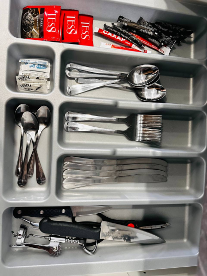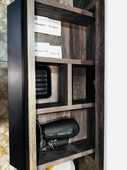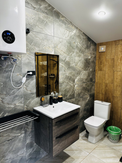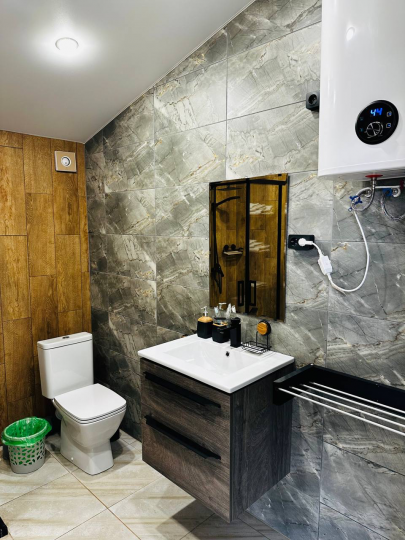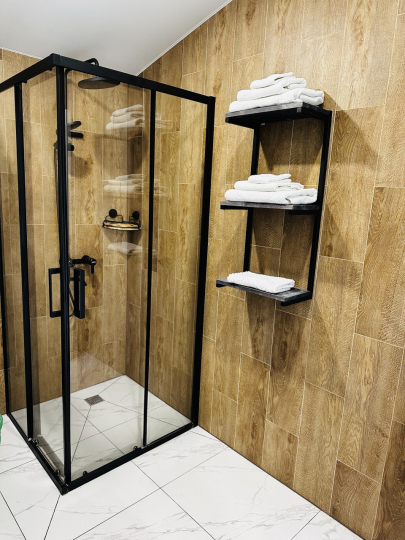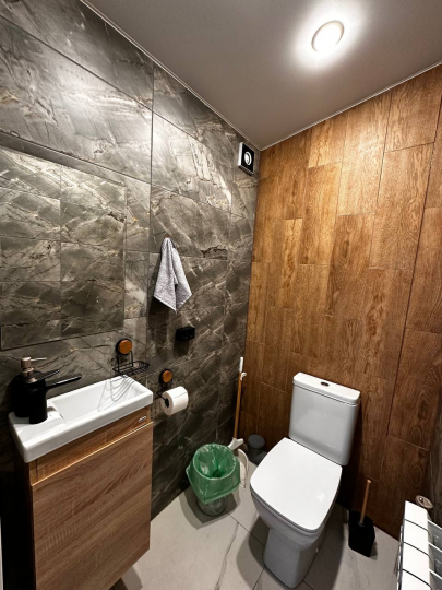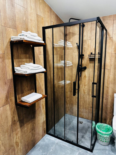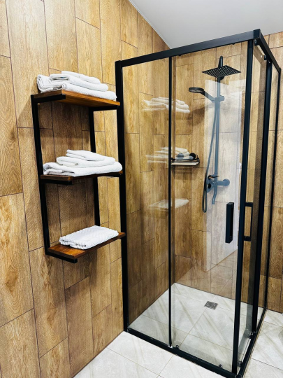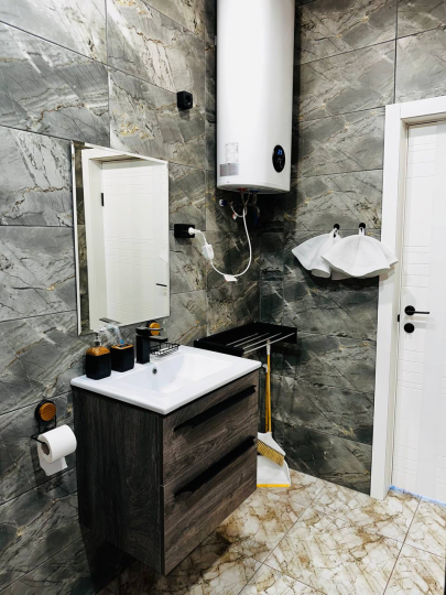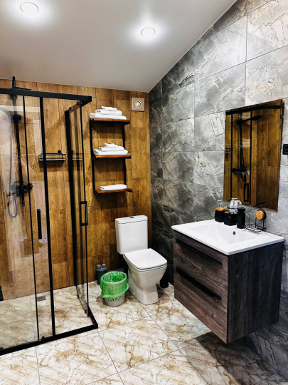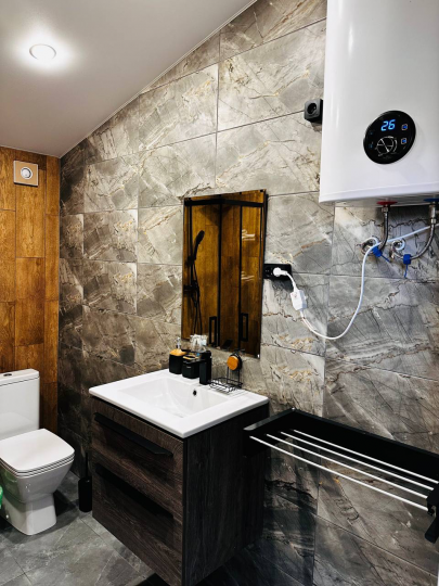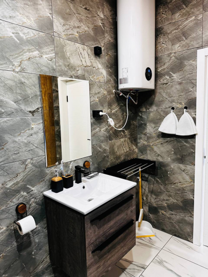Санузел: большая душевая кабина, раковина, водонагреватель, унитаз, туалетная бумага, тапочки, гели, шампуни, мыло, зубной набор, беруши, маска для сна, комплект полотенец, фен.