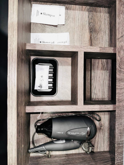Санузел: большая душевая кабина, раковина, водонагреватель, унитаз, туалетная бумага, тапочки одноразовы и сланцы резиновые, гели, шампуни, мыло, зубной набор, беруши, маски для сна, комплект полотенец, фен.