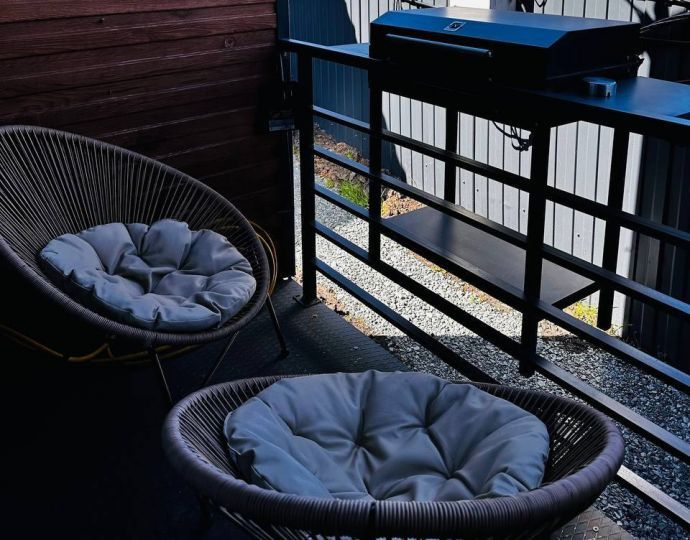 Задняя веранда (12 кв. м.): мангал и 2 кресла. Решетки, шампура, розжиг, уголь для мангала можно купить на ресепшен.