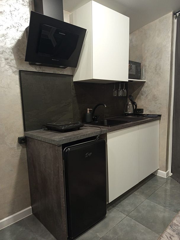 Спальная зона: двуспальная кровать и кресло. В кухонной зоне есть большой гарнитур, холодильник, микроволновка, чайник, индукционная плитка + посуда.