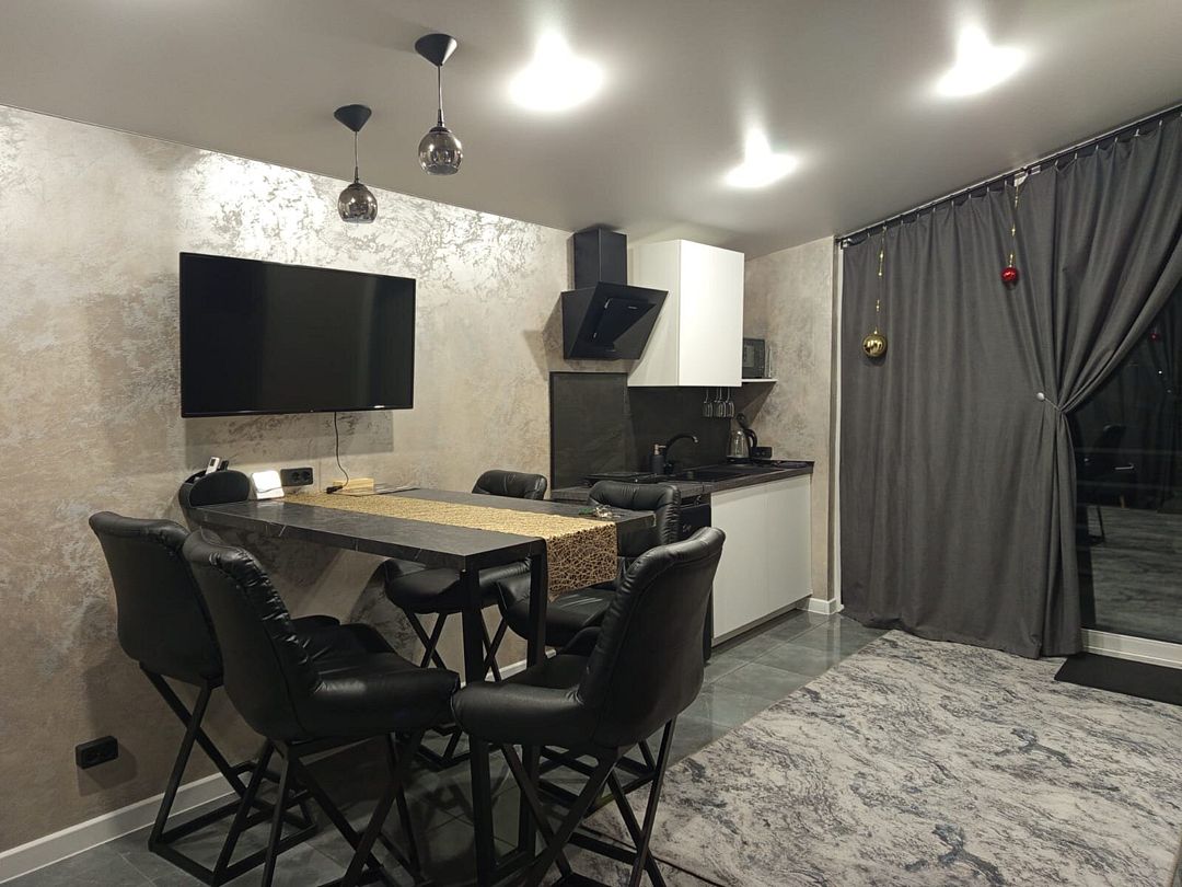 Большой зал с полноценным кухонным гарнитуром, микроволновая печь, чайник, электрическая плита, посуда и столовые приборы, моющие средства, большая смарт панель, кондиционер, два дивана, два больших стола, большой барный стол и барные стулья, санузел с раковиной.
