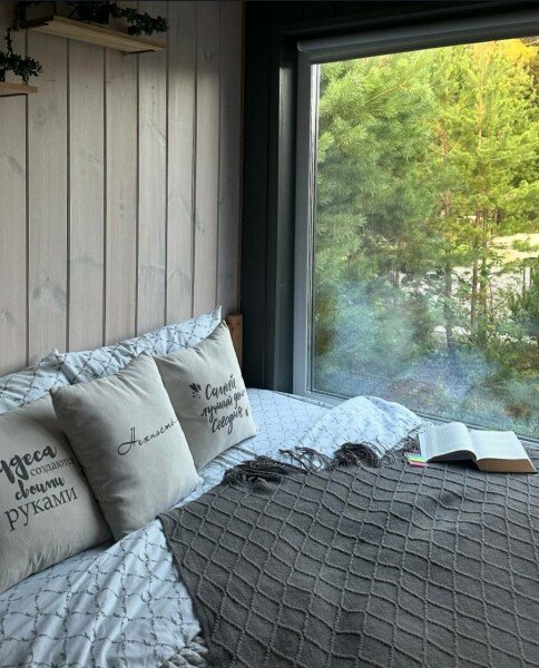 Для аренды доступны уютные барнхаусы «Стандарт» и «Комфорт», в которых предусмотрено всё для того, чтобы пребывание было наполнено уютом, комфортом и удобством. Из панорамных окон открывается красивый вид на сосновый лес.