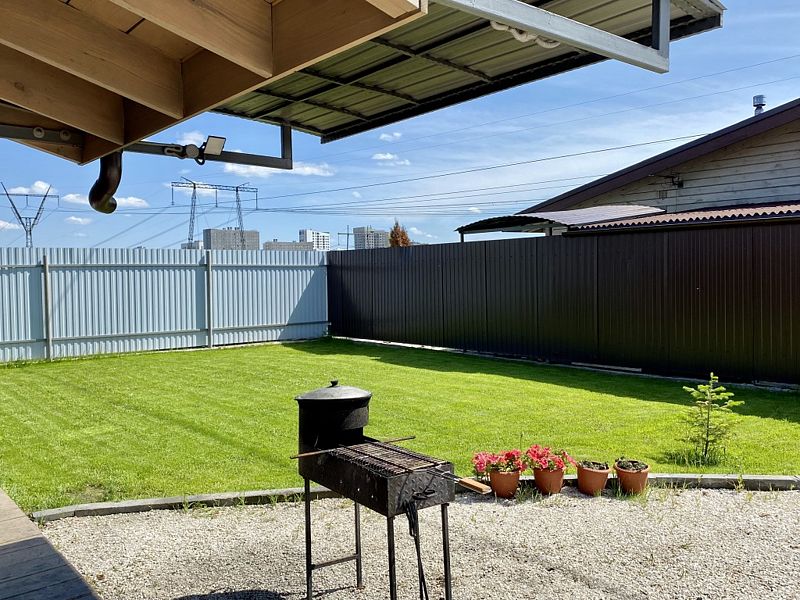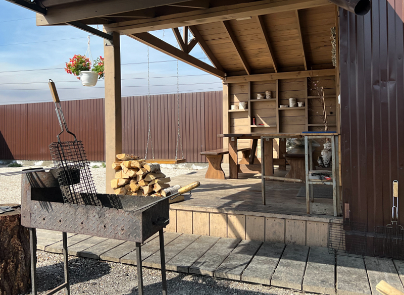 В доме: два больших раскладных дивана; кухня-гостиная со всем необходимым; теплые полы; терраса со столом, скамейками и качелью; мангальная зона.