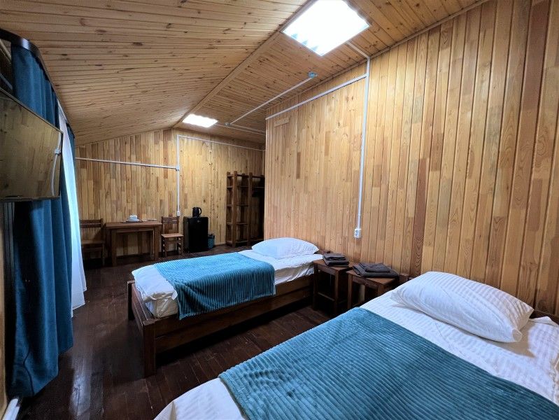 2 односпальные кровати, туалет и душ в номере, холодильник, телевизор, чайник.