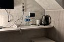 Есть плитка, микроволновка и чайник. На одну-2 ночи всего достаточно. Сантехника тоже в нормальном состоянии, хотя из душа натекло воды на пол по непонятной причине. Вроде бы есть теплый пол в столовой, ботинки сушили там.