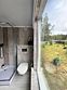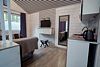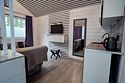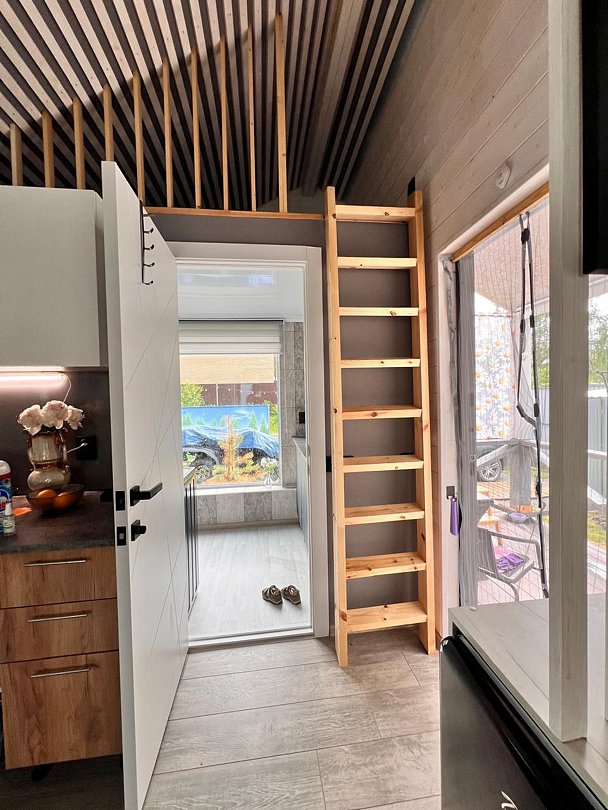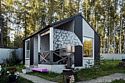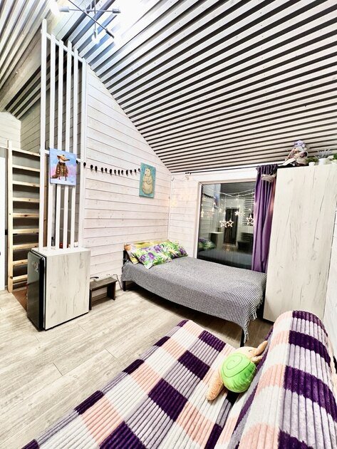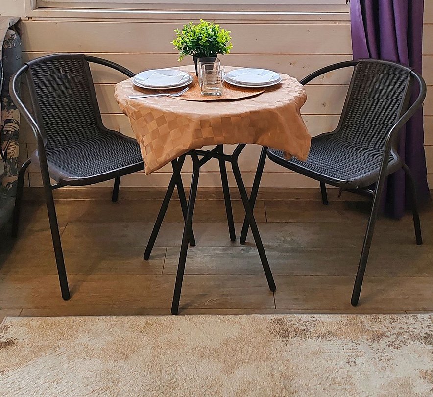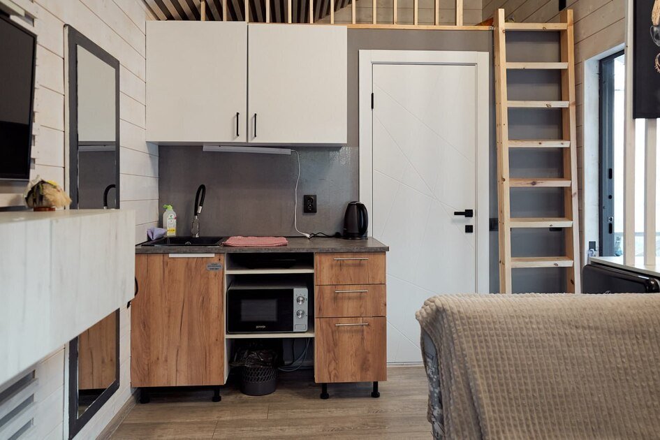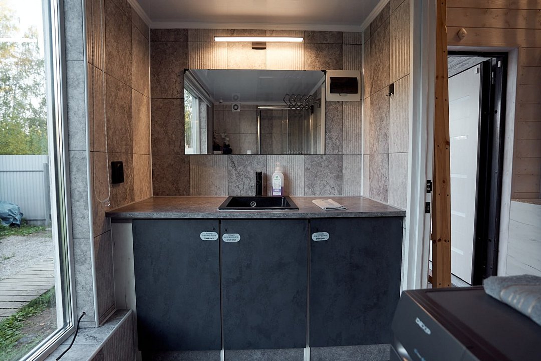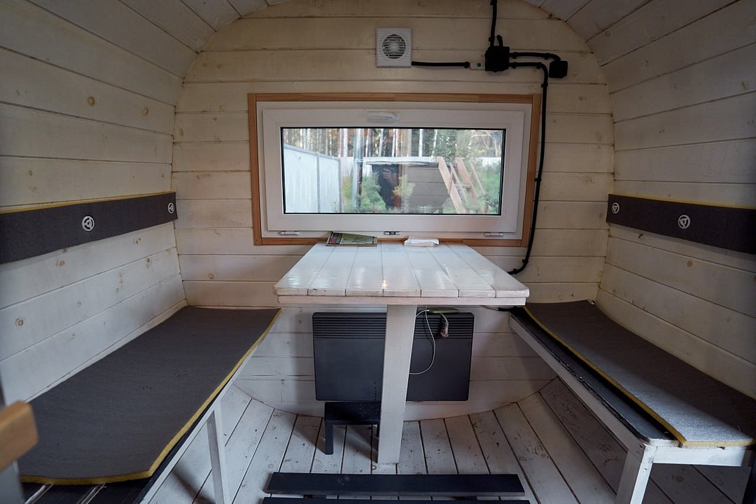 В домике с панорамными окнами, комфортно разместяться до 6 гостей, есть двуспальная кровать, раскладной диван, и спальное место второго яруса.