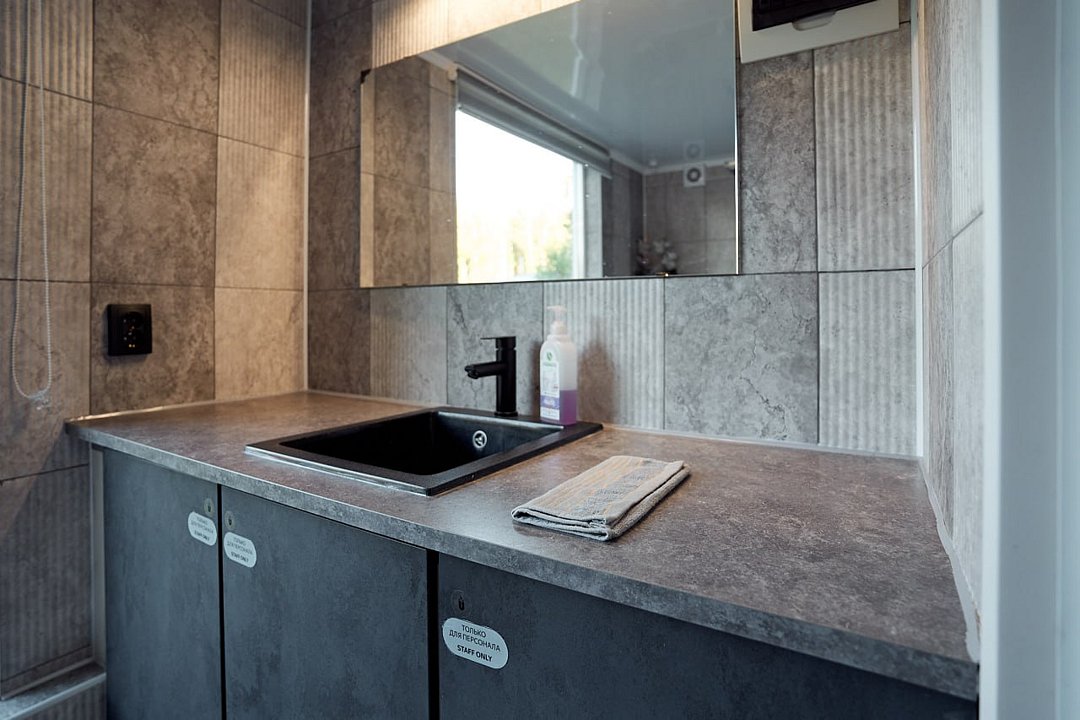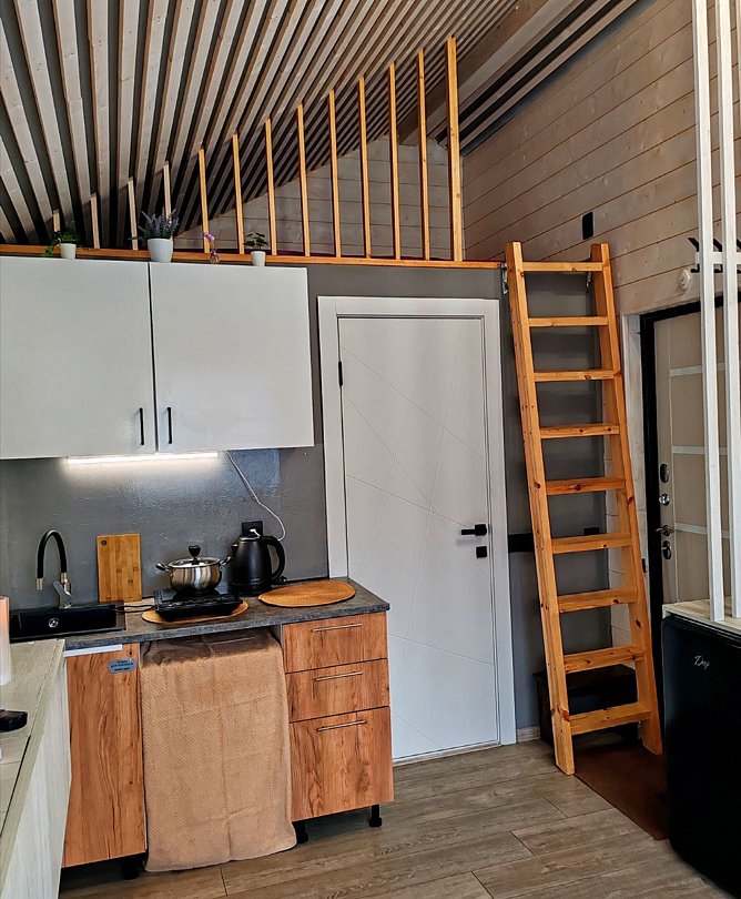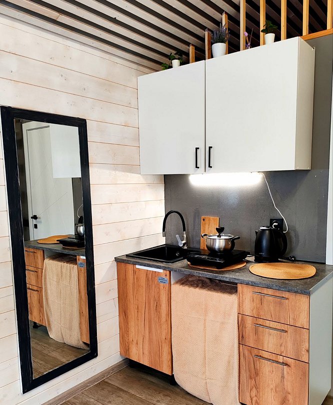 Сан. узел с душем, мини-кухня, набор полотенец. Утюг и фен,халаты по запросу.