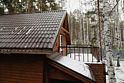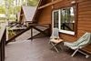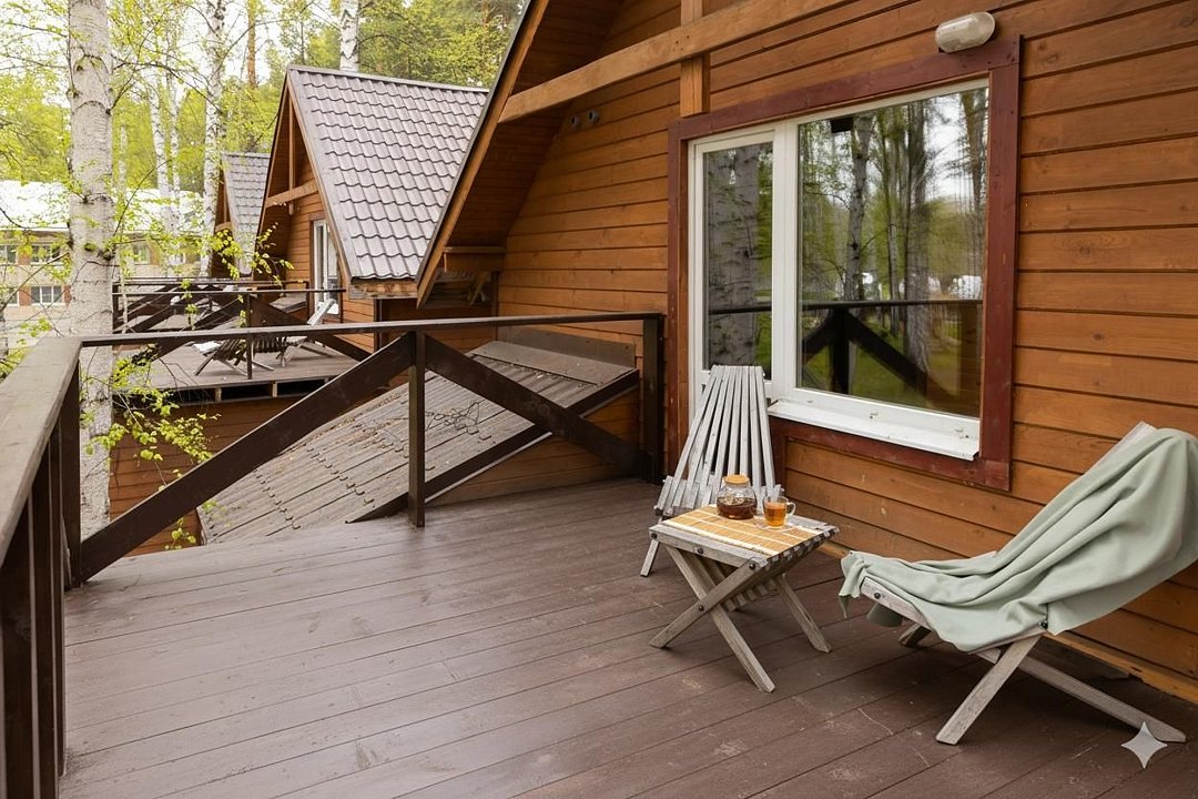 Двухэтажный дом с террасой и видом на сосновый лес.