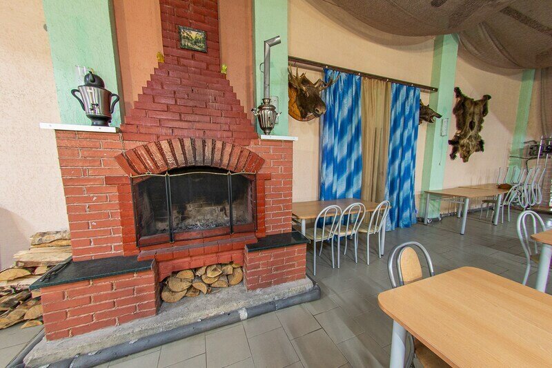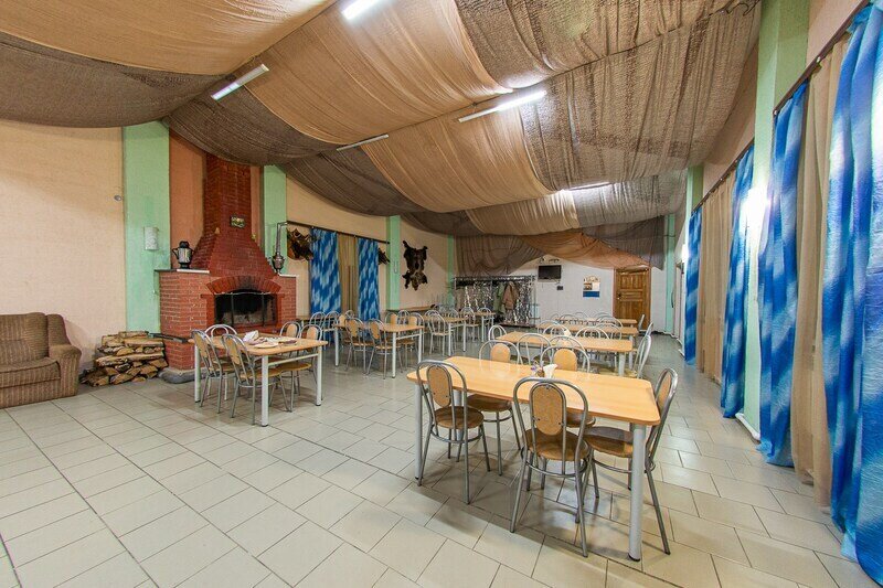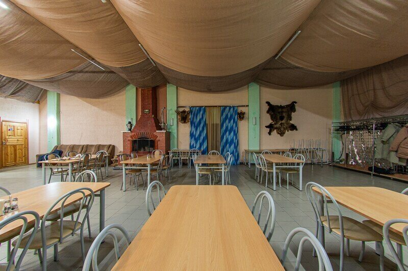 Большой банкетный зал с камином может вместить банкет на 60 персон. Уютный и вместительный зал к вашим услугам с посудой и мебелью для всех гостей.