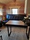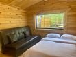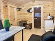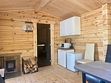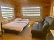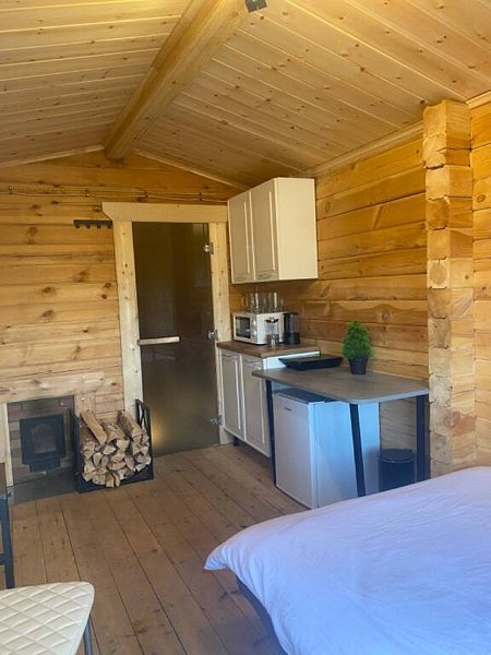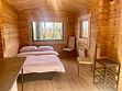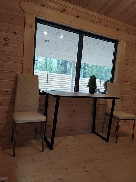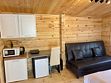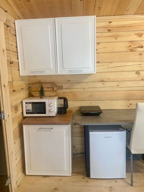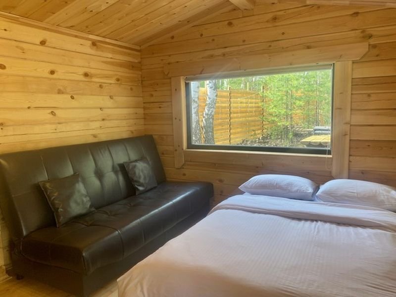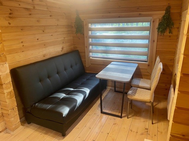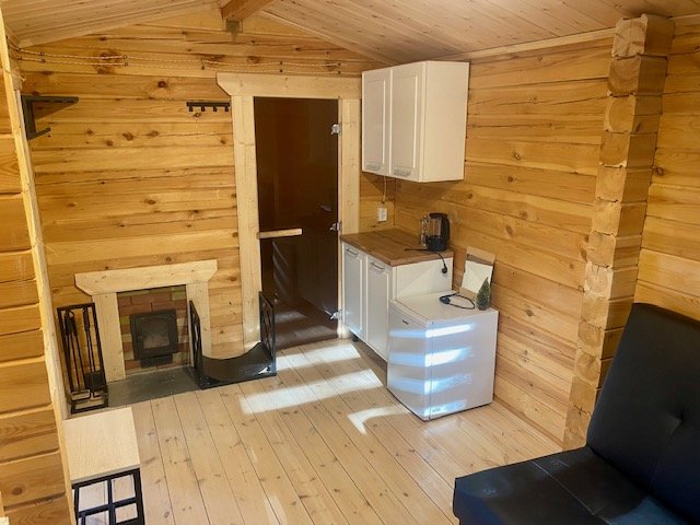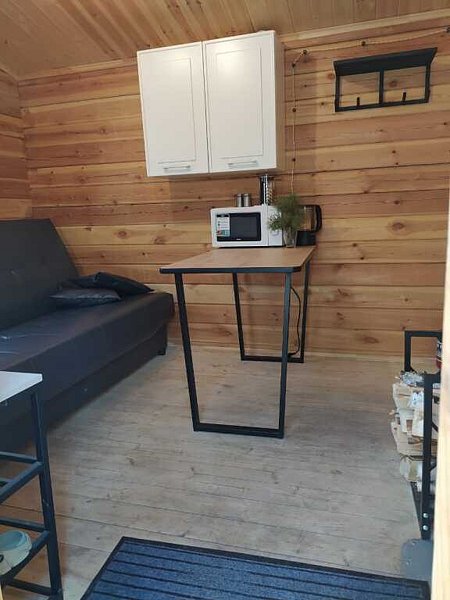 В домике находится небольшой камин, большая комната отдыха с кухонной зоной (микроволновка, холодильник, чайник, варочная панель), полный комплект посуды и постельных принадлежностей. Также несколько диванов для отдыха и релакса ( каждый диван раскладывается в двухспальную кровать).