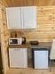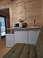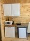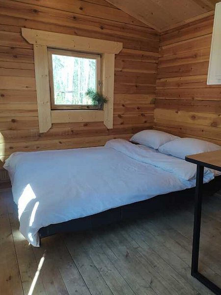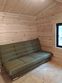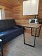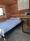 В домике имеется большая комната отдыха с кухонной зоной (микроволновка, холодильник, чайник, варочная панель), полный комплект посуды и постельных принадлежностей с двуспальным диваном кроватью. И спальня, в которой находится удобная двуспальная кровать с ортопедическим матрасом.