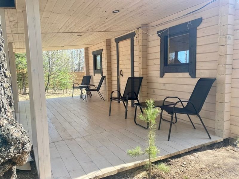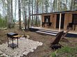 Уютный двухкомнатный домик с удобствами и большой террасой, рядом с которой стоит банный чан и батут для детей.