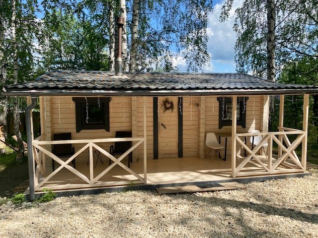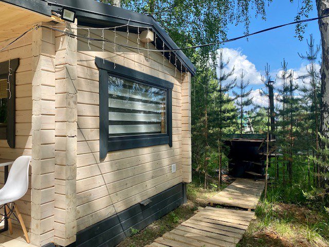 Домик построен из натурального дерева и имеет внутри незабываемый аромат сосны и кедра.