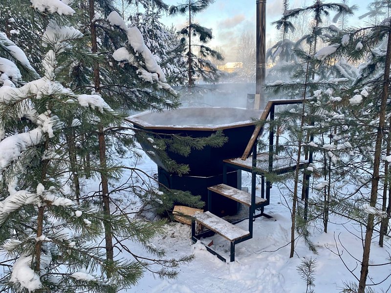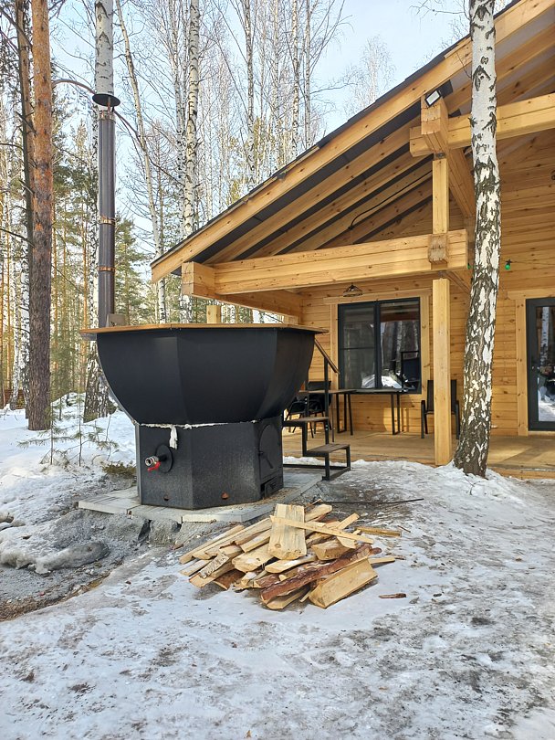 Каждый банный чан с домиком расположен на отдельном участке 15 соток, имеет отдельную мангальную и гриль зону.