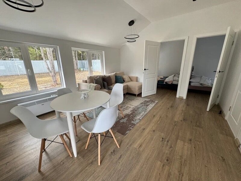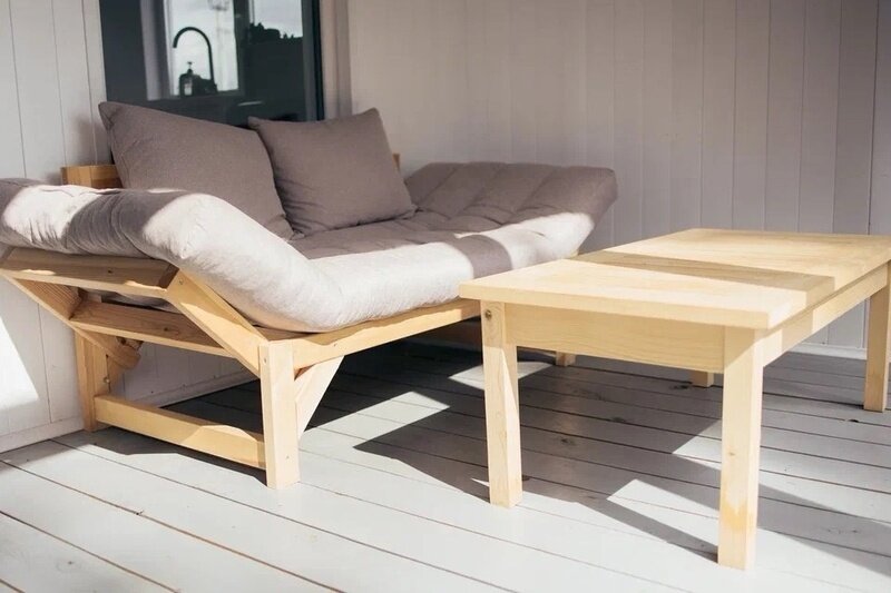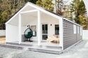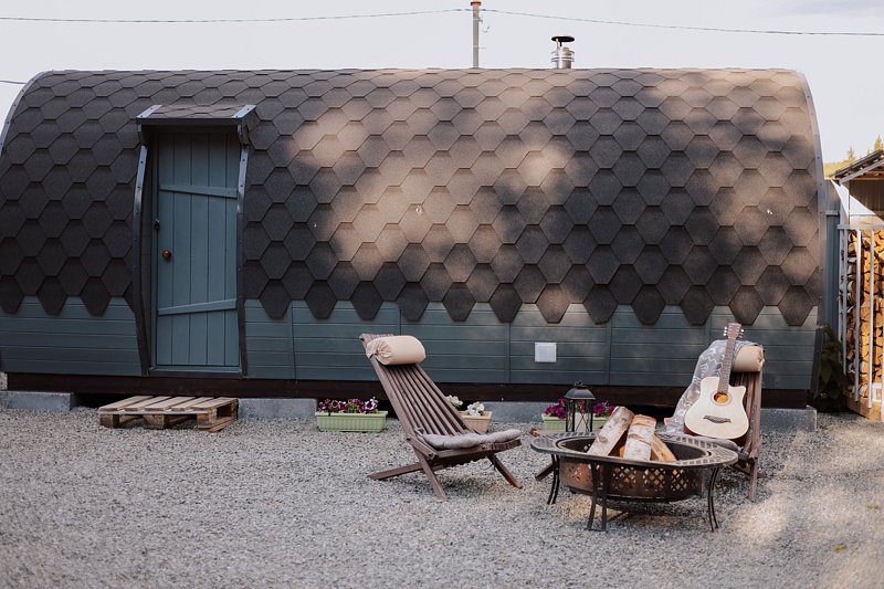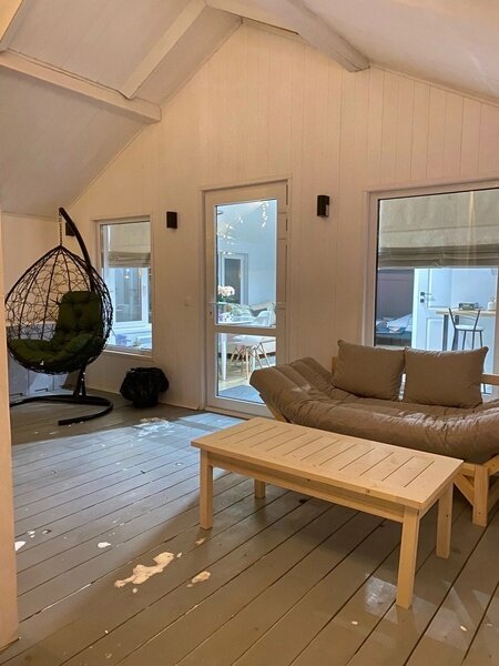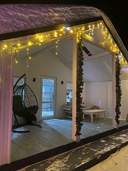 В вашем распоряжении будут: холодильник, микроволновая печь, чайник и вся необходимая посуда. Гостиная зона оборудована кухонным гарнитуром и удобным раскладным угловым диваном. В спальне вас ждет уютная двуспальная кровать. В санузле есть душевая кабина, раковина, унитаз и все необходимые принадлежности, включая одноразовые тапочки, гель для душа, шампунь, мыло, полотенца и фен. На веранде вы сможете расслабиться в подвесном кресле-качалке, а также посидеть за столиком или на уютном диване.