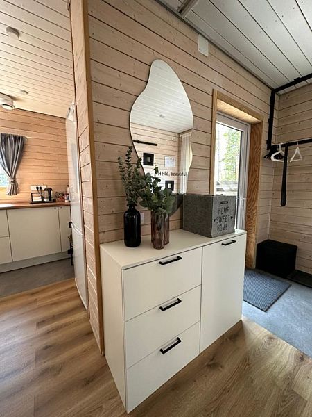 Раздвижной стол со стульями в финском доме, набор посуды на 6 персон, столовые приборы (вилки, ложки, ножи, штопор), холодильник, чайник, чай и сахар, специи, плита, микроволновая печь, кухонные полотенца, вода из скважины (глубина 50 метров).
