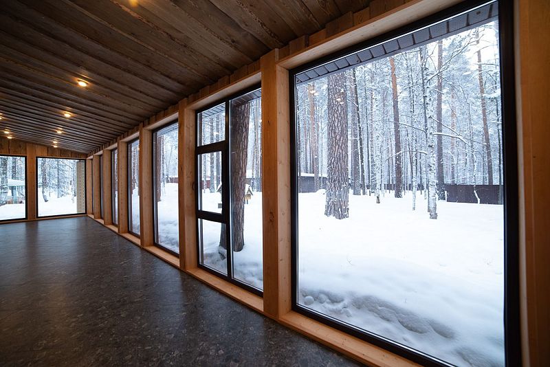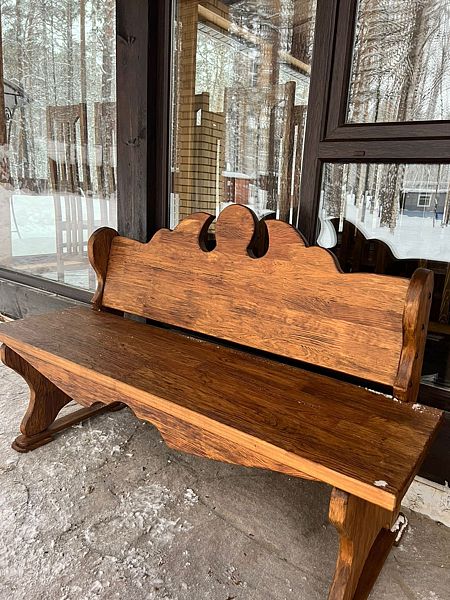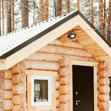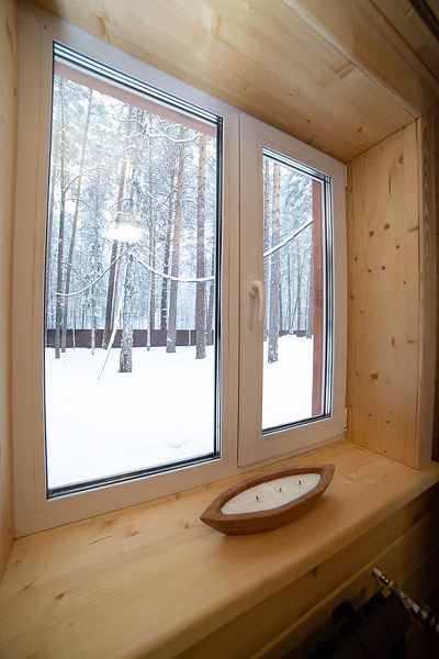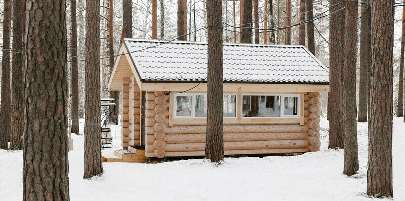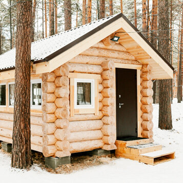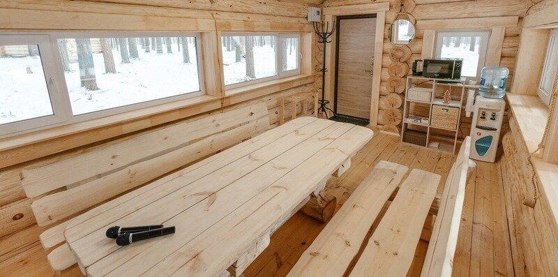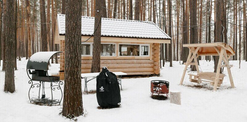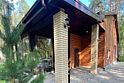 Беседка крытая, утепленная представляет собой крепкое бревенчатое сооружение, с террасой. Строения расположены в сосновом бору — вокруг лесной ландшафт. При нахождении в беседке, не теряется связь с природой. Эффект обеспечивают большие окна.