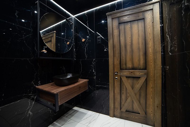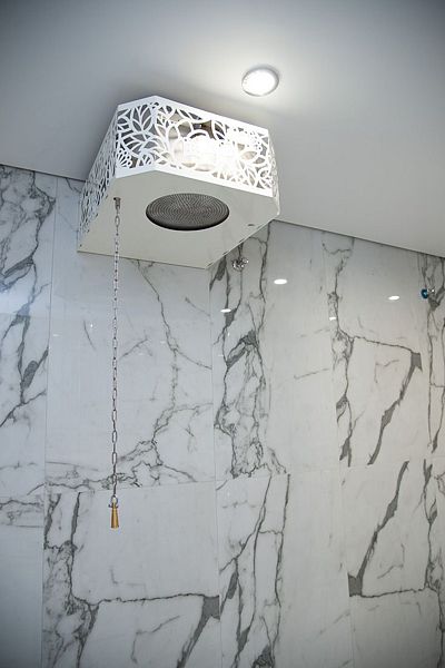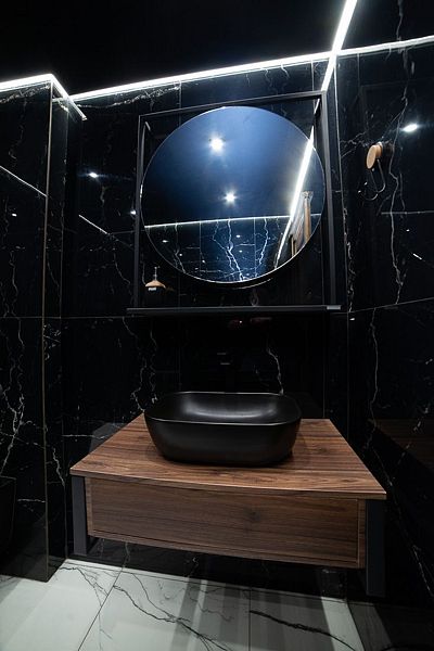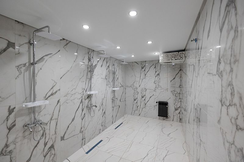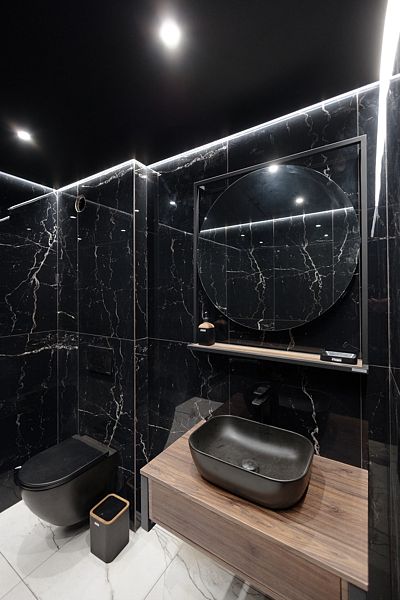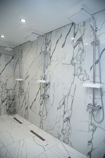 Большая душевая комната с белого мрамора с ведром-водопадом! 2 санузла в стильном черном исполнении под мрамор!