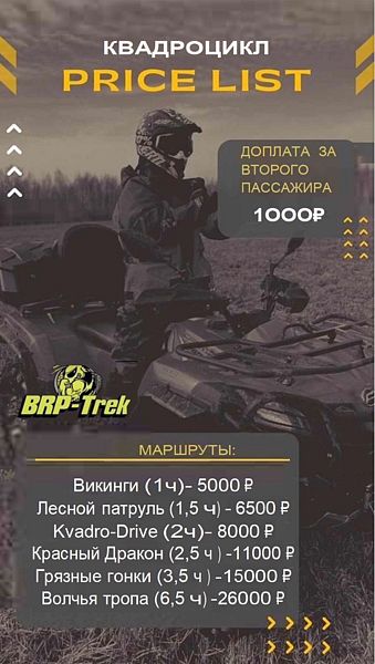 Прайс-лист с ценами за 1 час на прокат квадроциклов для корпоратива: