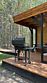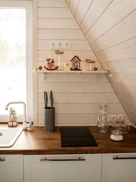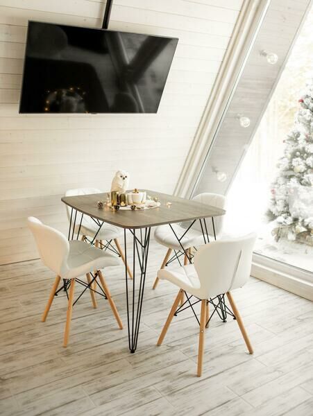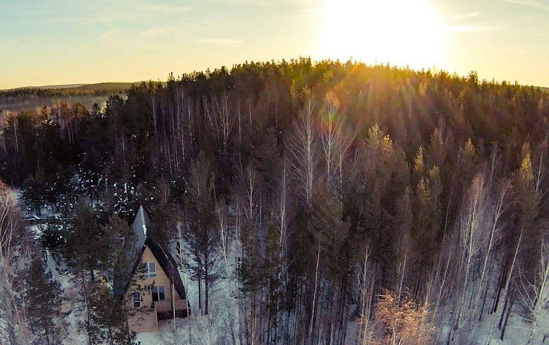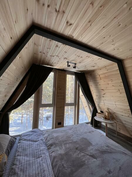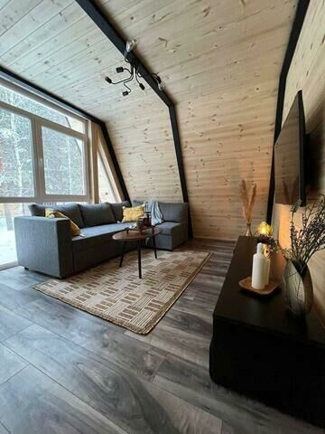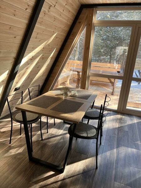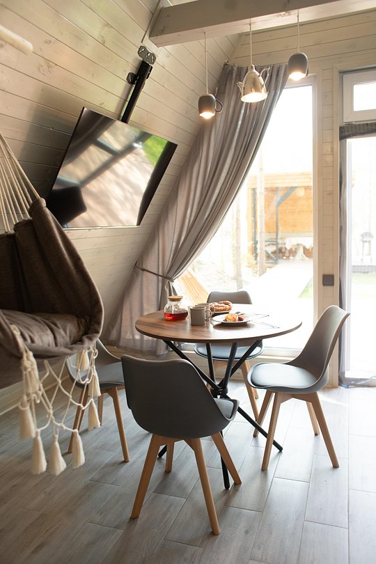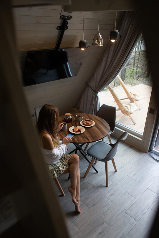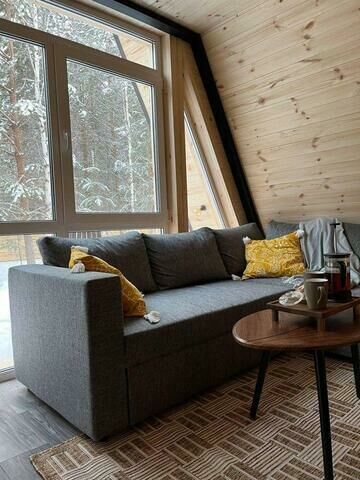 В домике есть абсолютно всё необходимое для комфортного и уютного проживания. А панорамные окна позволяют любоваться видом на лес.