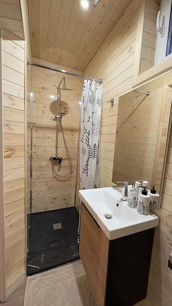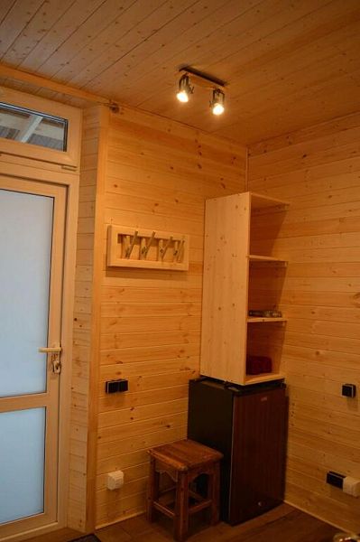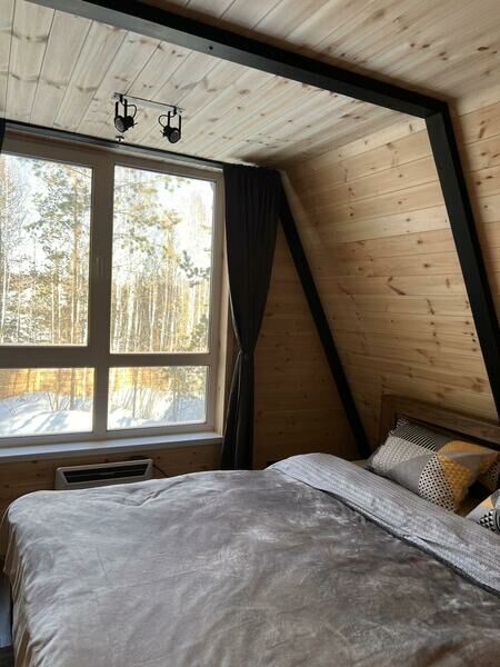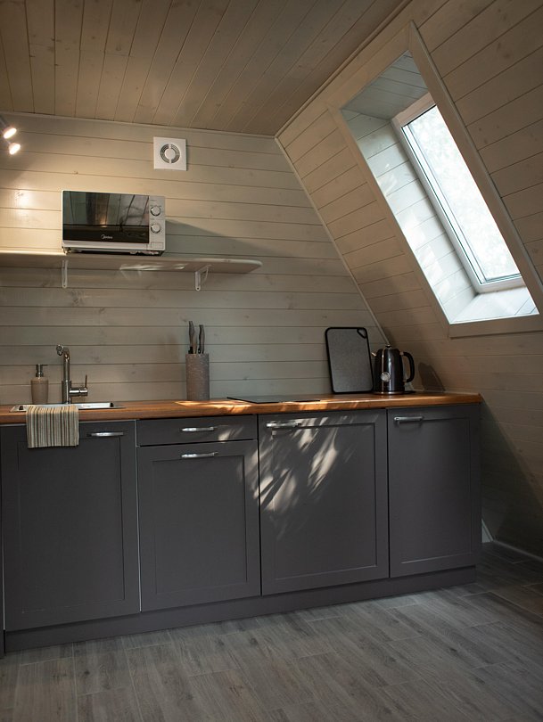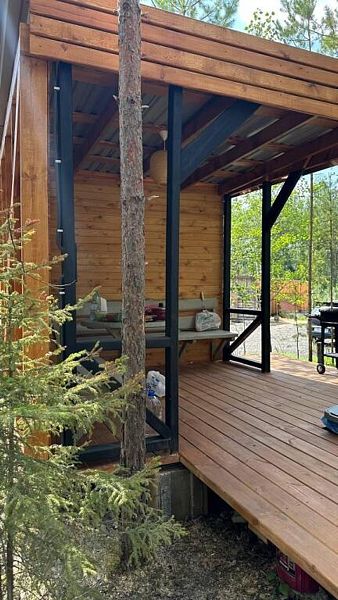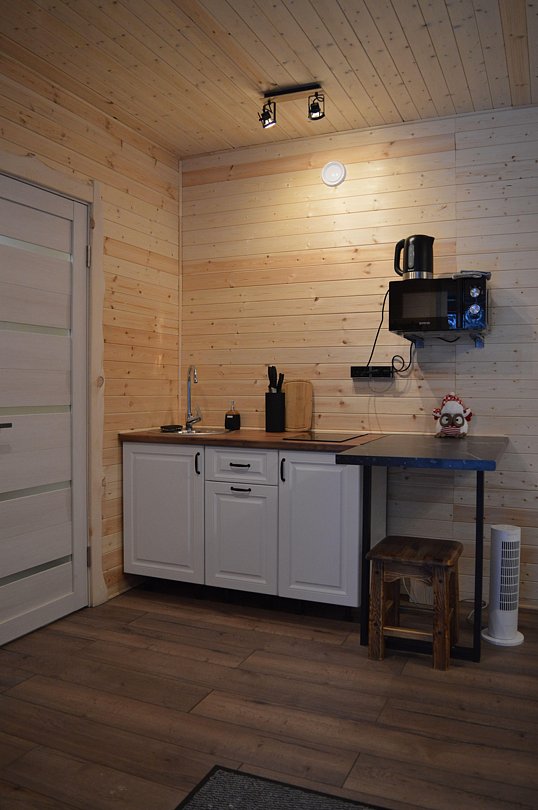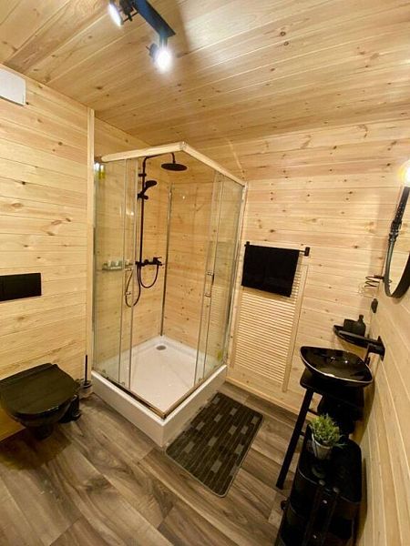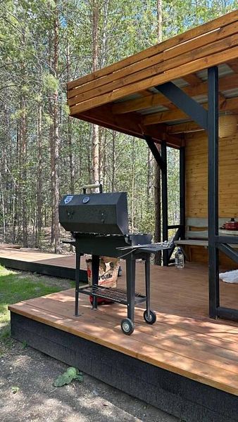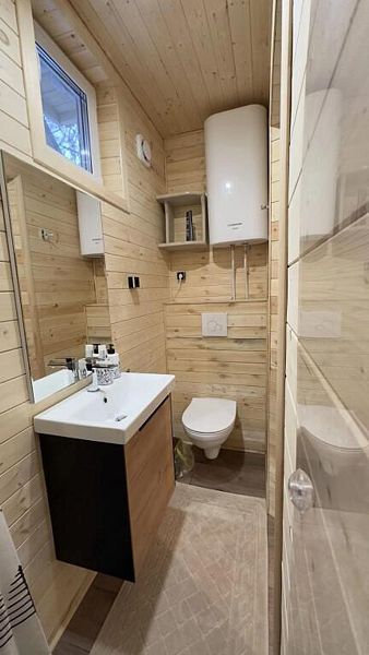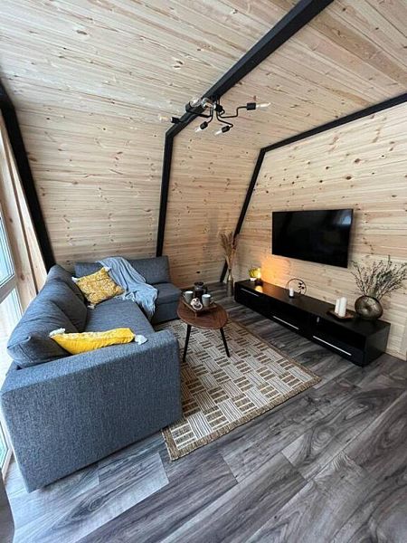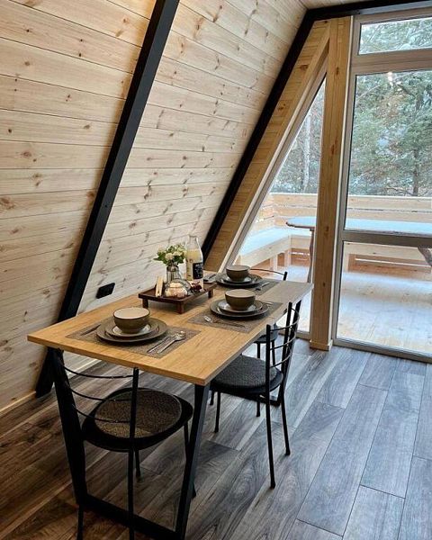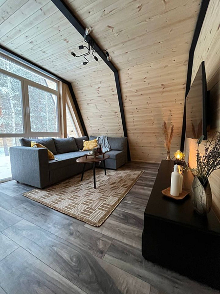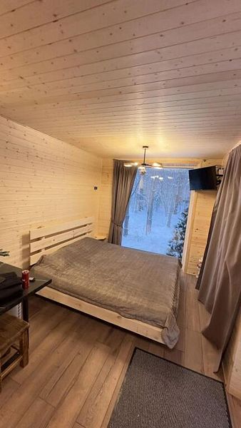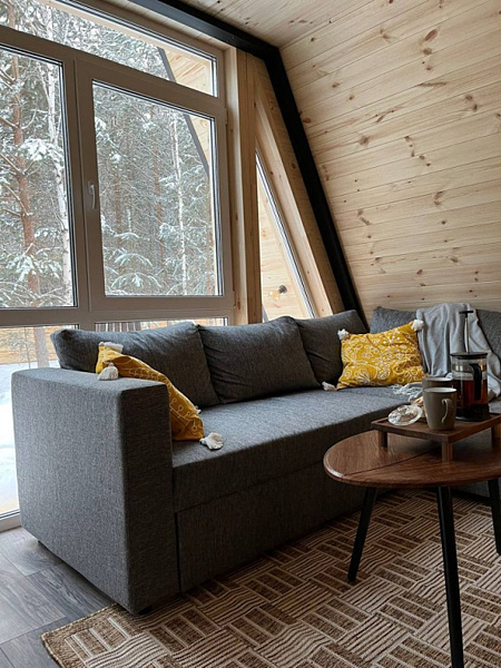 В домике есть абсолютно всё необходимое для комфортного и уютного проживания. А панорамное окно позволяет любоваться видом на лес. В домике теплые полы, а также конвектор.