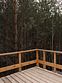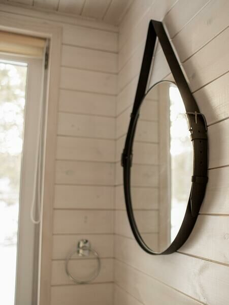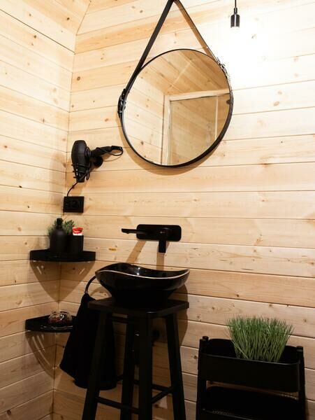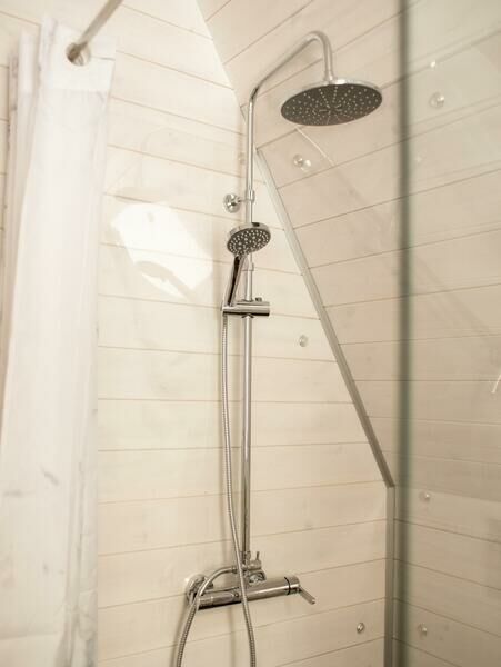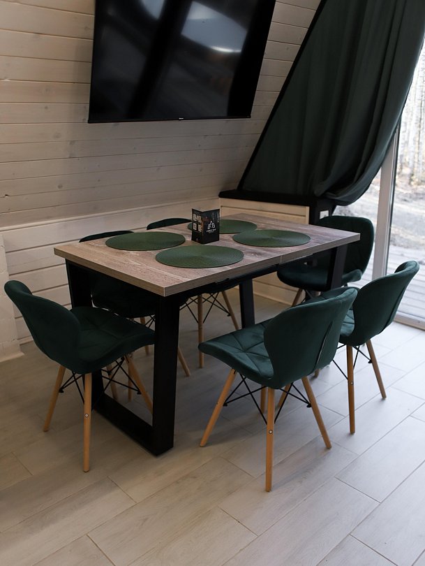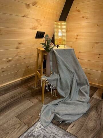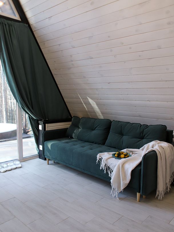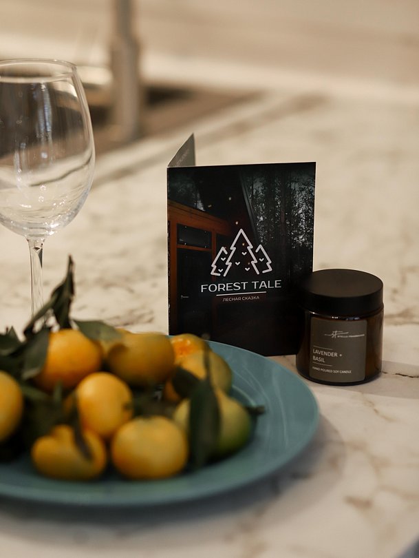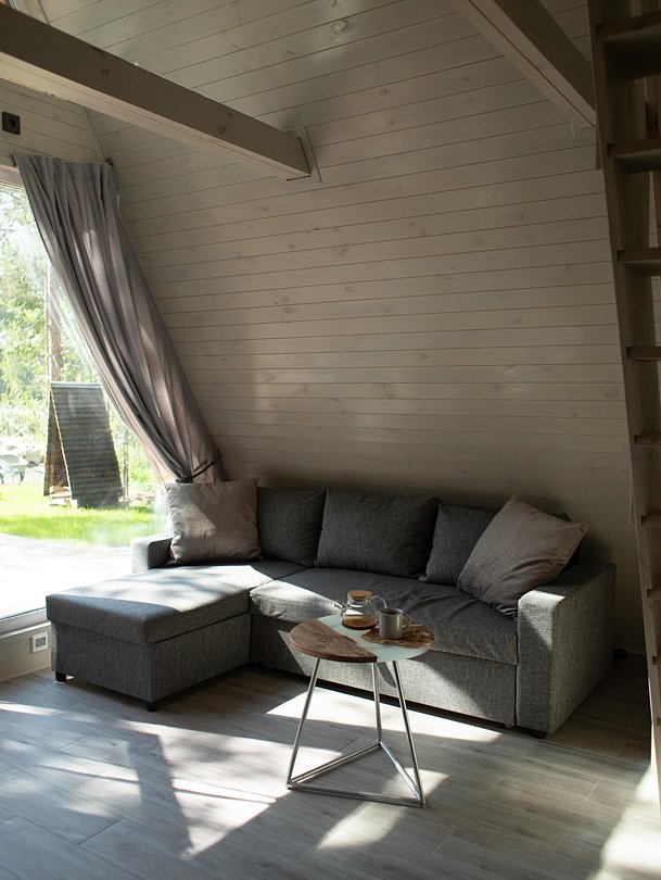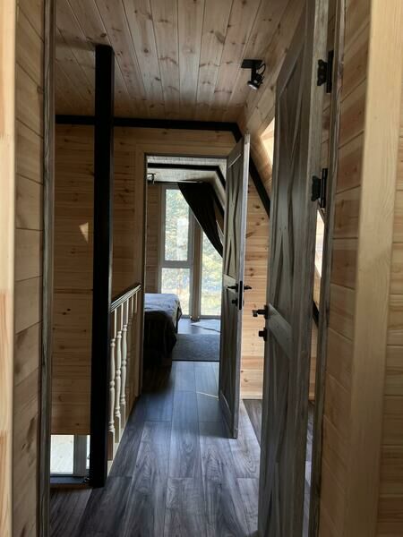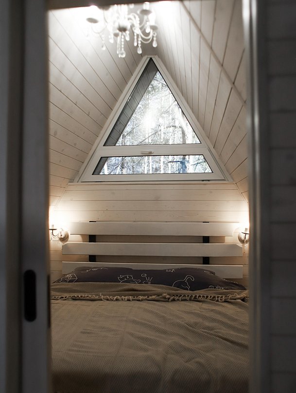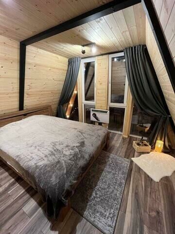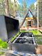 В домике есть абсолютно всё необходимое для комфортного и уютного проживания. А панорамное окно позволяет любоваться видом на лес. В домике теплые полы, а также конвектор.
