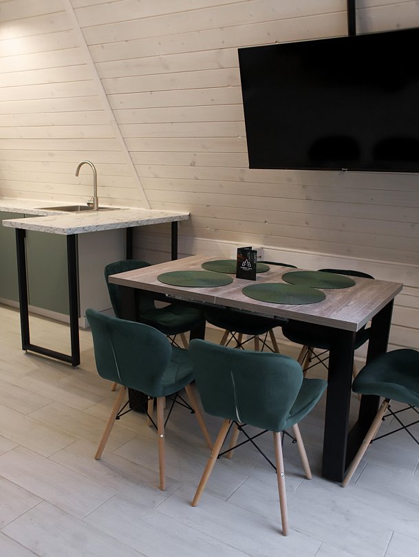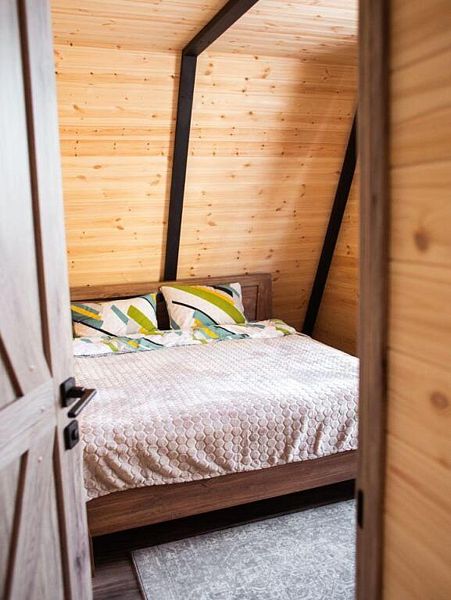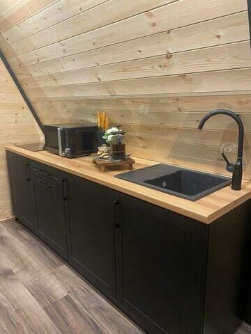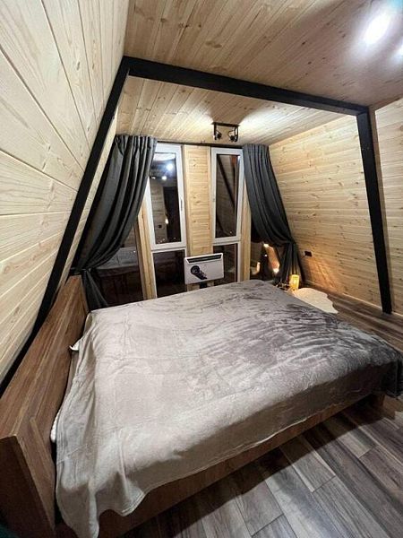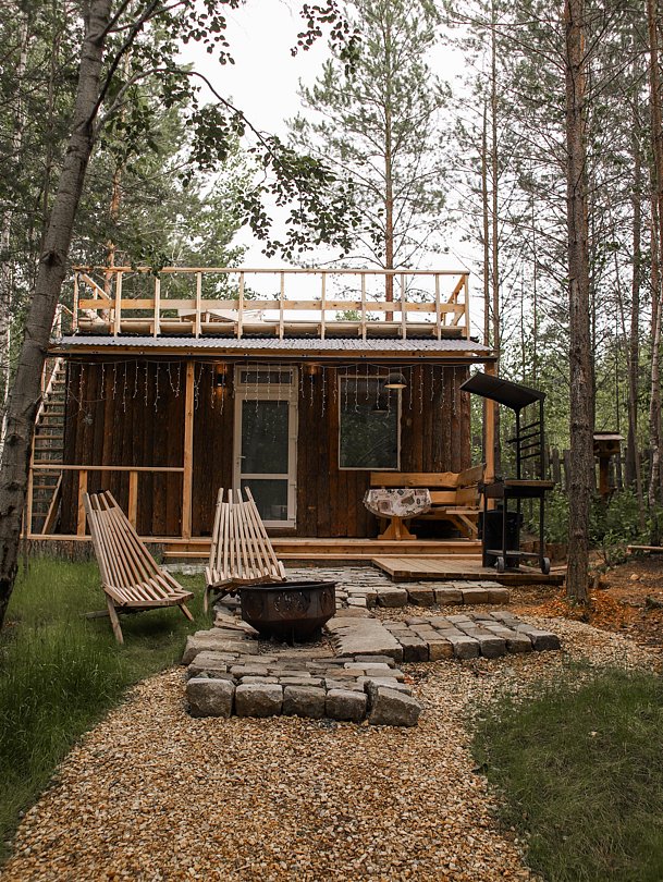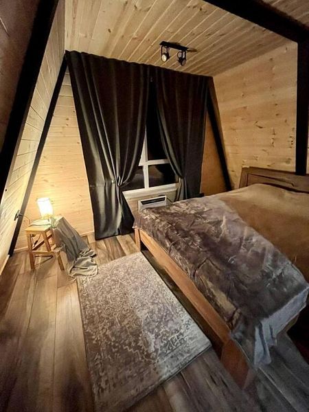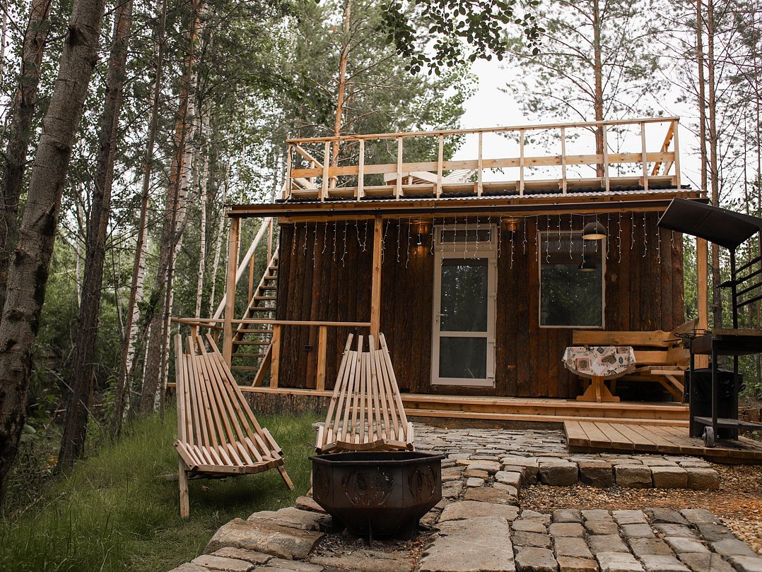 Полностью оборудованная кухня, варочная панель, СВЧ-печь, посуда для приготовления и сервировки. Санузел, душевая. Комплекты полотенец на каждого гостя. Кровать 180х200, телевизор. Терраса на крыше дома, мангальная зона и костровая зона, а также все принадлежности для барбекю. Домик рассчитан на 2х человек.