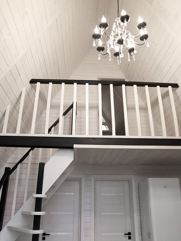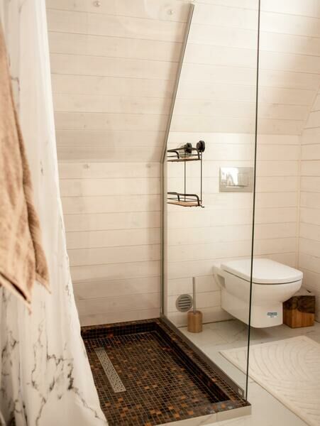 На первом этаже гостиная, кухня, обеденная зона, санузел с душевой кабиной.