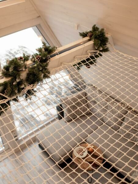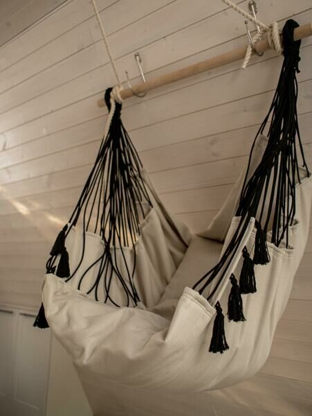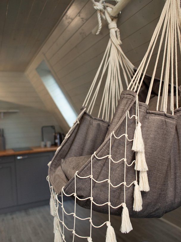 Спальный диван на первом этаже и огромное спальное место на верху с открытым панорамным видом. Уютная гостиная, где и происходят все главные действия. Есть подвесной гамак-кресло.