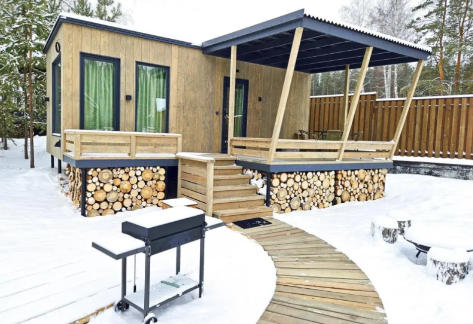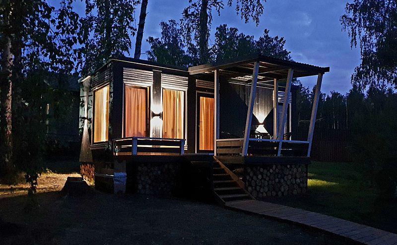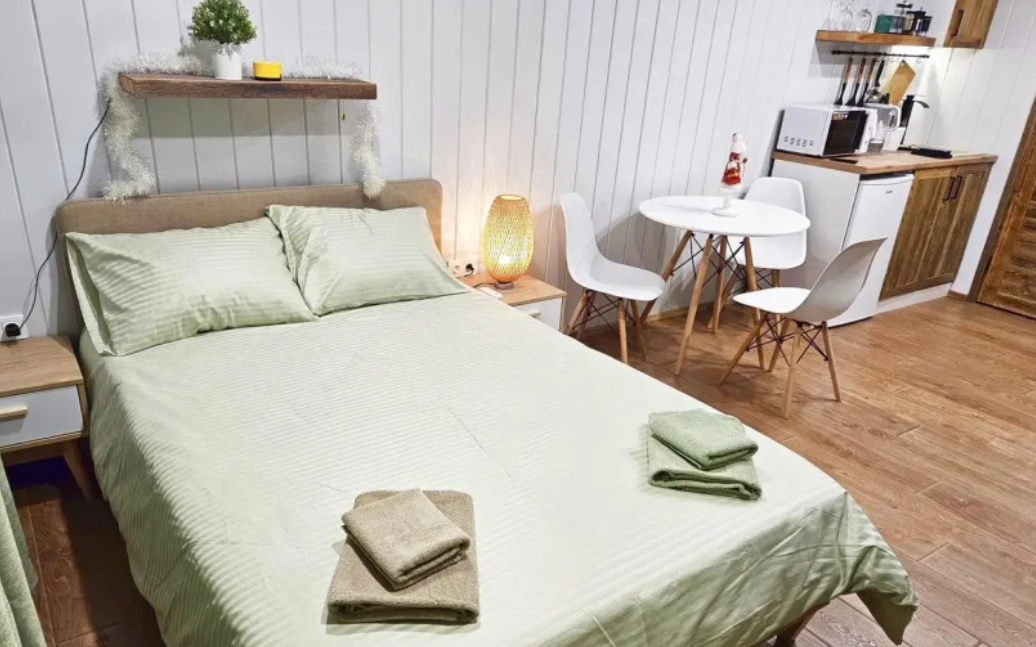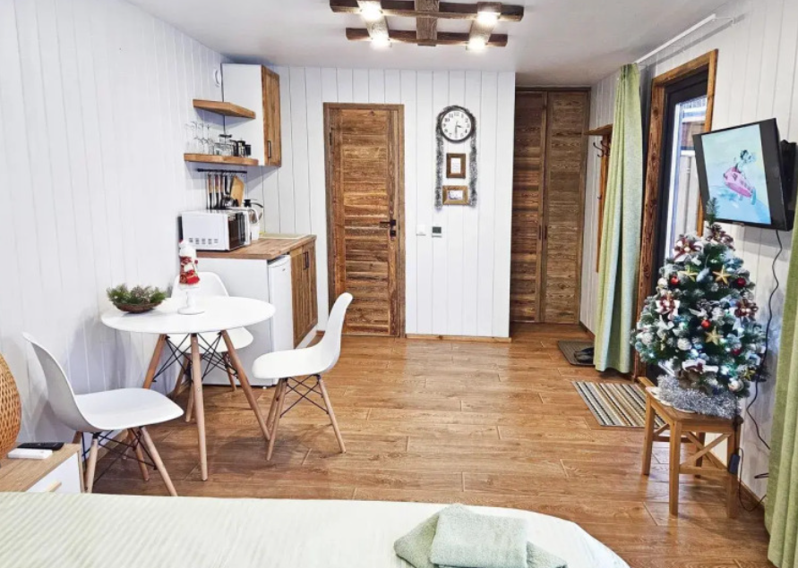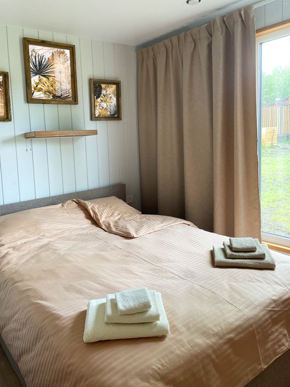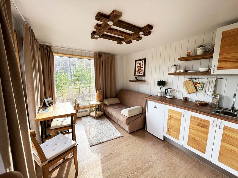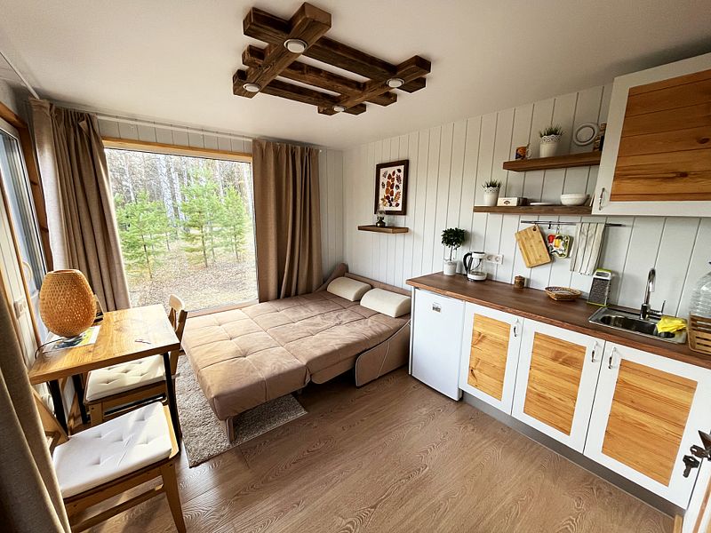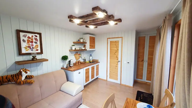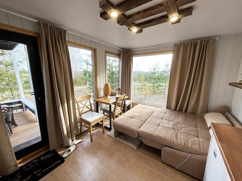 Уютный, с меблировкой и элементам декора из ретро-доски. Двухкомнатный домик обеспечивает дополнительный уют, благодаря тому, что пространство разделено на спальню и гостиную.