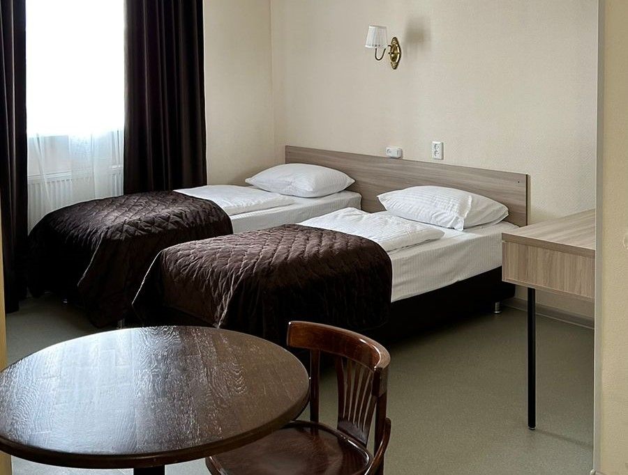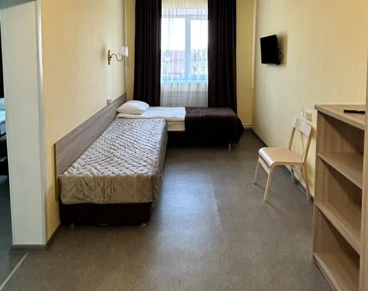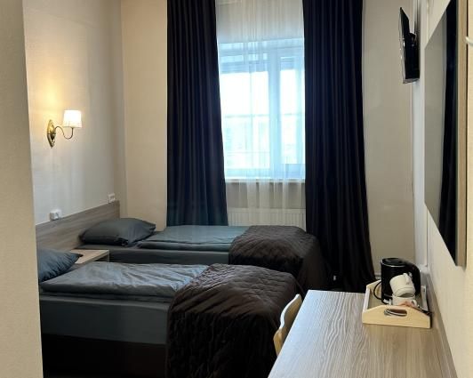 2 односпальные кровати, ТВ, холодильник, чайник, с/у с душем; окно выходит в подъезд гостиницы