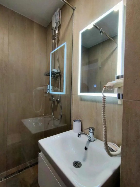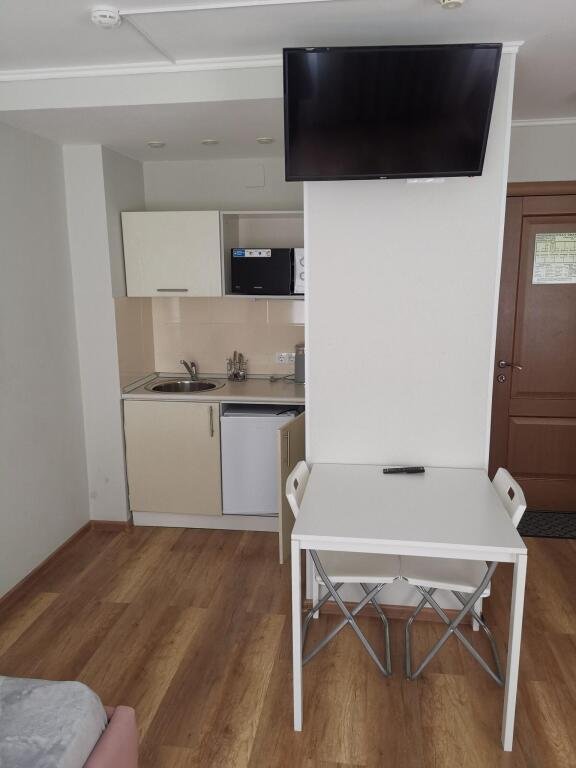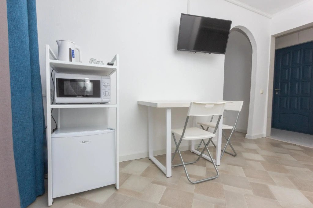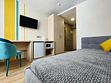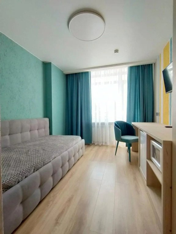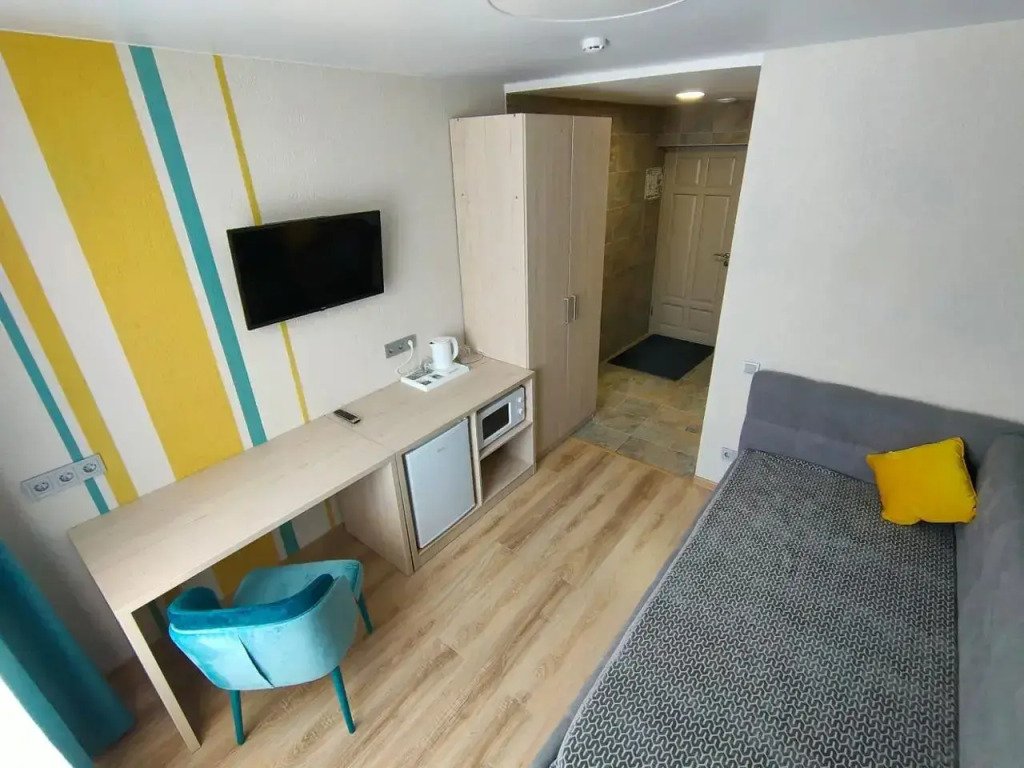 Диван-кровать (односпальный), 1 тумбочка, шкаф, рабочее место, TV, СВЧ печь,сейф, холодильник, чайная станция, набор для приготовления чая/кофе, набор посуды. Санузел с душевой.Набор косметики: шампунь,гель для душа, мыло. Халат, одноразовые тапочки. Завтрак включен на 1 гостя.Услуги и удобства