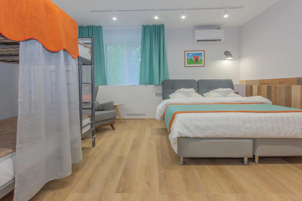 Номер предназначен для отдыха семей с детьми от 0 до 10 лет. 2-спальная кровать, 2-ярусная кровать, ТВ, СВЧ печь, Х, кондиционер, с/у с душем.