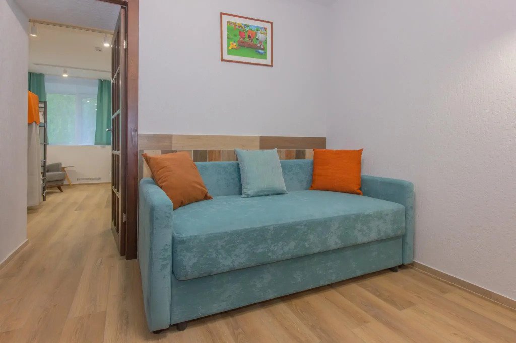 Три 1-спальные кровати, диван, ТВ, Ч, СВЧ-печь, Х, с/у с душем.