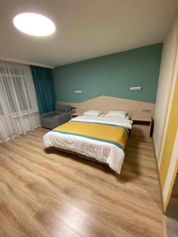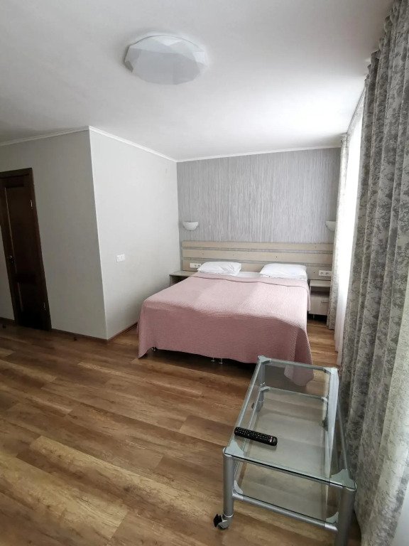 Максимальное количество спальных мест - 4. Общая площадь номера - 20 кв метров. В номере - двуспальная кровать, двуспальный диван, тумбочка, шкаф, удобства (душ и санузел) - в номере.